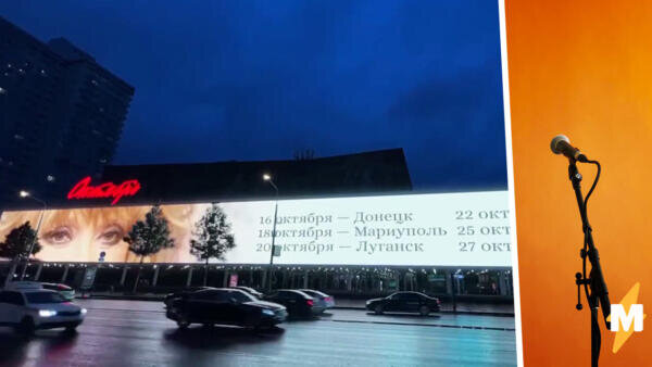 На цифровом баннере московского кинотеатра "Октябрь" появился анонс тура певицы Аллы Пугачёвой по городам Донбасса. Пользователи рунета предполагают, что с помощью рекламного щита кто-то мстит Примадонне за пацифистскую позицию и вылет из России. В Сети развирусились видео с цифровым баннером на кинотеатре "Октябрь" в Москве, на котором анонсируется концертный тур Аллы Пугачёвой "Порядок в головах". Судя по надписи, выступления якобы пройдут в украинских городах -- Мариуполе, Херсоне, Мелитополе, Донецке и Луганске. Алла Пугачёва. Всероссийский концертный тур "Порядок в головах", -- гласит афиша. Пользователи соцсетей уверены, что афиша фейковая, и с её помощью недоброжелатели троллят Примадонну за пацифистские высказывания. Ранее певица также попросила признать её иноагентом вслед за мужем Максимом Галкиным*, о чём можно прочитать в материале Medialeaks. Рустем АдагамовНа световом панно кинотеатра "Октябрь" на Новом Арбате крутят фейковую рекламу концертного тура Аллы Пугачёвой по го