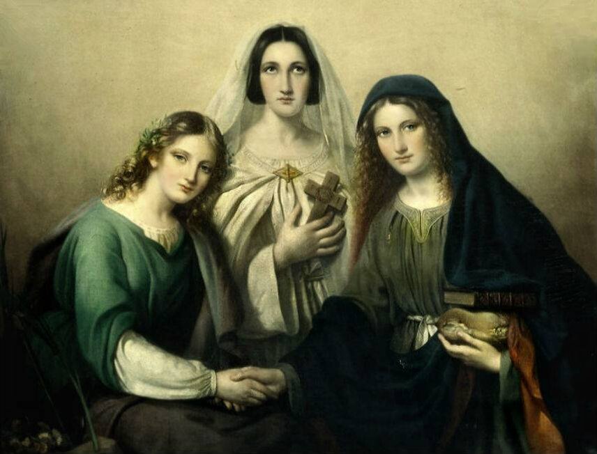 Вдова из Милана по имени София и три её дочери: Пистис, Элпис и Агапэ приехали в Рим во II веке нашей эры, за христианскую проповедь были убиты язычником императором Адрианом, который хотел заставить их принести дары богине Диане. Солдаты Адриана умертвили девочек на глазах их матери, а сама София скончалась на следующий день у могилы своих дочерей. Церковь причислила мучениц к лику святых, и по сей день верующие христиане считают, что по молитвам к ним происходят чудеса. На старославянский язык имена дочерей были переведены дословно — Вера, Надежда и Любовь, и только имя матери — София (Мудрость) оставили без перевода.