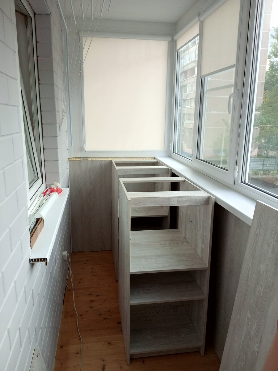 Все обсуждали с заказчиком, какие дверки, куда чтоб открывались и т.п. Со столешкой я ошибся для тумбы. Не знаю почему, но не учел подоконник за тумбой и глубины столешницы не хватило. Позже подвезем другой кусок. Распашной шкаф именно такой необходим, антресоль выглядит несуразно из-за дверок распашных, но остановились именно на таком варианте. Во-первых пользоваться ей клиент будет крайне редко, во-вторых дорогие подъемные механизмы ставить не целесообразно на балкон, в третьих, чтобы закрыть поднятую вверх дверцу, нужно будет ставить табурет. А так открыл, закрыл, удобно. Чтобы такие широкие двери не отвалились, я поставил по три петли на каждую. Думаю все прослужит долгие годы. Столик овальный сделали, клиент просил. Выглядел он как то странно, для каких целей ему нужна такая столешница, я не понял. Оказалось он купил крепление на стену, к нему нужно столешницу прикрутить. Помогли, сделали. Ну так... столом это назвать нельзя, но поставить чашку кофе или чая, можно, если присе