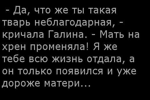 И тут Галину прорвало. – Да, что ж ты какая тварь неблагодарная, - кричала она. – Мать на хрен променяла! Я тебе всю жизнь отдала, а он только появился и уже дороже матери?
