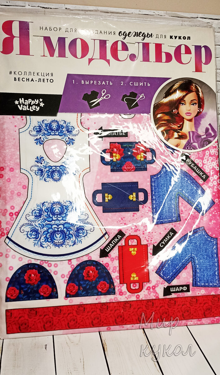 На вб (wildberries) очень часто попадались различные наборы "Я модельер". Было очень интересно посмотреть что это такое, какое качество у этих наборов и как одежда будет смотреться на куклах. И вот однажды наткнулась на набор с интересной расцветкой, решила, что как раз его я и посмотрю) Вот так выглядел мой набор. Это один сплошной кусок ткани с цветным принтом, по контуру которого можно вырезать: платье под гжель, джинсовую рубашку, шапку, шарф и 4 сумки. Все просто - вырезать и сшить. Сзади набора еще более подробная инструкция. Под силу этот набор осилить даже ребенку. Кстати, мне настолько понравился розовый принт по краям, что сшила из обрезков комплект для Челси (статья про девочку тут). Вырезала, сшила и вот что получилось. Моделью была выбрана Лина. В платье. Добавляем шарф. Теперь куртку и сумку. Одеваем шапку и полный образ получается таким. Очень даже неплохо. Но мне показалось слишком уж простовато. Поэтому решила немного доработать модели - ворот платья украсила стразами