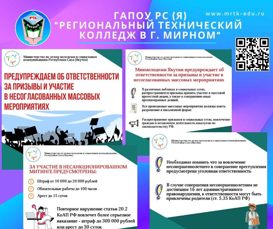 Министерство по делам молодежи и социальным коммуникациям РС(Я) предупреждает об ответственности за участие в несанкционированных публичных мероприятиях. Граждане имеют право проводить собрания, митинги и демонстрации, шествия и пикетирование, собираться мирно, без оружия.