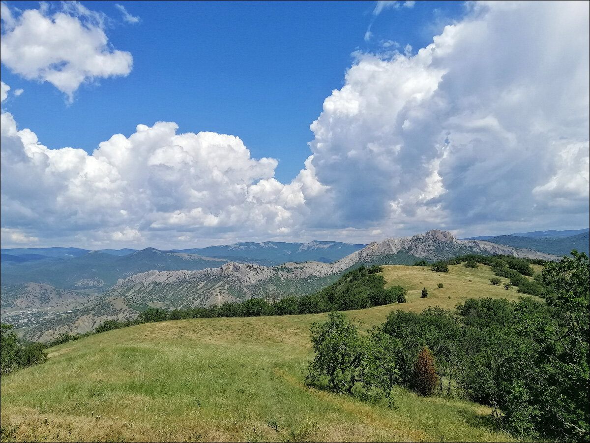 А с другой стороны хребта тоже прекрасные горы, местный Таракташ, а западнее видны Кошачьи ушки горы Чатал-Кая, куда мы однажды ходили походом. Но пока мы ещё не всё посмотрели на Токлуке. Наш путь на запад — к крайней горе Ай-Георгий — вверх-вниз, с одной горки на другую. Здесь просто классно! Ковыли серебрятся. Сочная летняя зелень. Какие облака, какие синие дали! Красиво! Изумительно…