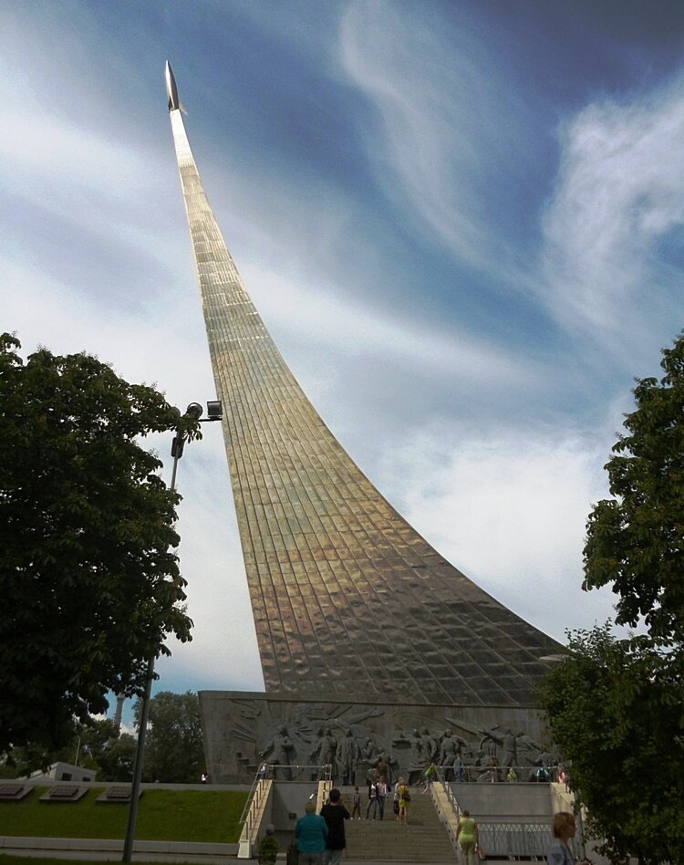 Рядом с ВДНХ находится монумент "Покорителям космоса" – один из интереснейших московских памятников. В его основании расположен вход в Мемориальный музей Космонавтики. Грандиозное сооружение первоначально хотели установить в честь запуска первого искусственного спутника Земли. Пока шла работа над проектом, в космос полетели первые космонавты. Так что, решили посвятить первым покорителям космоса. Торжественное открытие состоялось 4 ноября 1964 года. Музей космонавтики открыт позже – в 1981 г. Памятник покрыт полированным титаном, применяемым в ракетостроении. Титановые пластины не подвержены коррозии, а еще они интересно отражают небо. Монумент венчает скульптура ракеты. Интересно, что прототипа для ее создания у авторов не было. Ракетостроение тогда было делом новым, все макеты ракет были строго засекречены. Так что архитекторы М.Барщ и А.Колчин и скульптор А.Файдыш-Крандиевский создали обобщенный образ, в основе которого – изображение с советских плакатов и открыток, популярных в