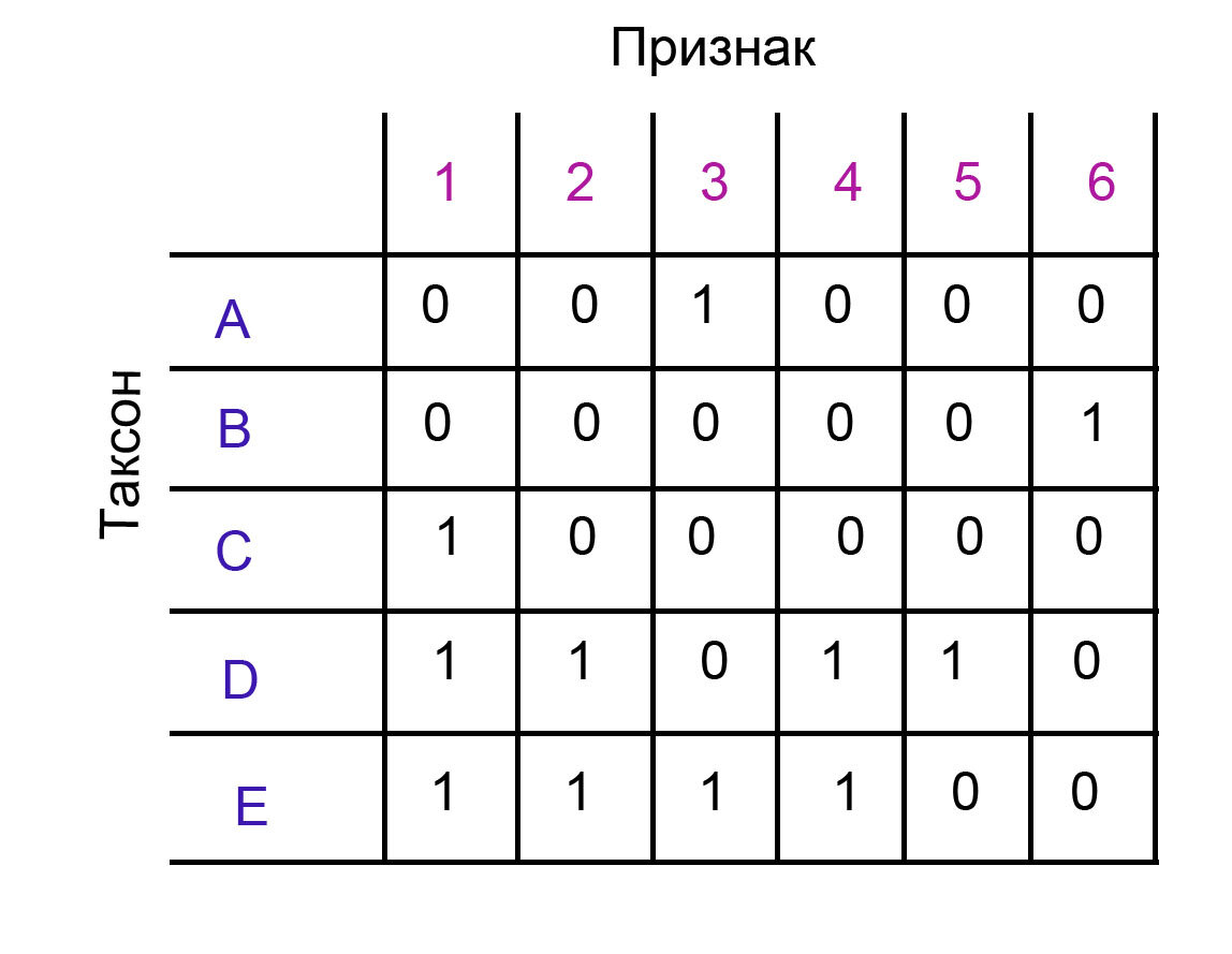 То есть, для признака 1, g = 2, потому что состояние 0 у него появляется 2 раза, а состояние 1 - три раза. Почему это максимальное количество шагов? Просто потому что следуя принципу парсимонии, мы должны расположить признаки на кладограмме экономно, и в таком случае состояние, которое появляется у большего количества таксонов, будет предковым, и максимальное количество появлений признака на кладограмме будет равняться количеству таксонов, у которых будет менее популярное состояние.