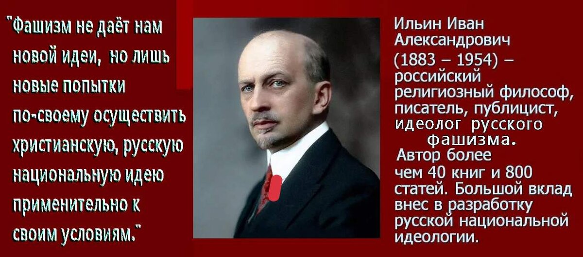Краеугольным камнем изменения политики государства, является смена его идеологии. А в военное время, отсутствие адекватной идеолгогии, угрожает привести страну к поражению. Может именно поэтому, 30 сентября, в "день воссоединения русских земель", президент заговорил о защите традиционных ценностей в России. Цитируя своего любимого, о чем он неоднократно заявлял, философа - Ивана Ильина, Владимир Путин однозначно дал понять, какая идеология близка его сердцу. Поэтому, чтобы лучше разобраться с "тараканами в голове" у нашего президента, крайне важно обратить внимание на личность самого Ивана Ильина и его идеи.💡 Иван Ильин родился и вырос в Российской Империи. Философ придерживался монархических и православно-патриотических взглядов на жизнь, являясь ярым антикоммунистом, что и привело его к концепции "монархофашизма"! Будучи ярым монархистом и сторонником "белого движения" Ильин счиал, что Россия просто не может жить без церкви и царя! После революции и последующего поражения "белог