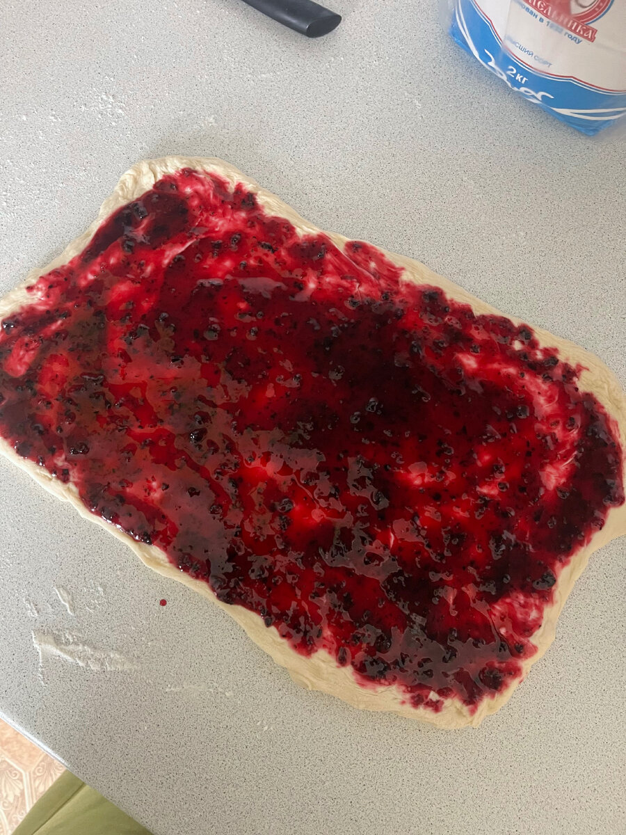 Как и обещала в предыдущем посте, рассказываю вам куда же нам использовать третью часть теста. Рецепт теста также можете посмотреть в предыдущем посте про капустный пирог. Раскатываем наше тесто в прямоугольник. Главное, раскатывать на хорошо присыпанной мукой поверхности, чтобы тесто не прилипало. Сверху на тесто хорошо размазываем по всей поверхности варенье. В данном случае вы можете взять абсолютно любое варенье, у меня было смородиновое. Либо же взять свежие ягоды, проварить их с сахаром, остудить и добавить вместо варенья. Либо ту же процедуру сделать с замороженными ягодами, но добавить уже к ним пару ложек кукурузного крахмала, чтобы не было излишней влаги. Я предпочитаю готовить просто и быстро. Да и варенье есть у каждого в холодильнике🙃 Либо это хороший повод съездить к вашим мамам/бабушкам за вареньем. Далее мы наше тесто сворачиваем в рулем с длинной стороны. Делаем это очень аккуратно, чтобы начинка никуда не потекла. После этого мы перекручиваем наш жгут из теста и сво