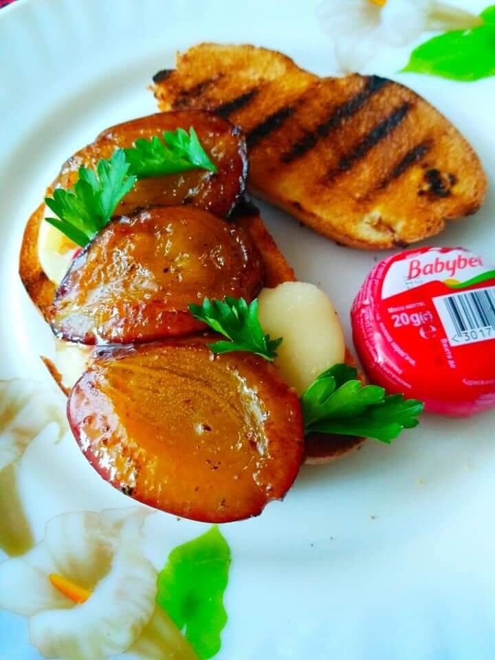 На горячий кусочек булки выложить сыр, сверху горячие ароматные сливы. Сыр станет мягким, поплывёт)