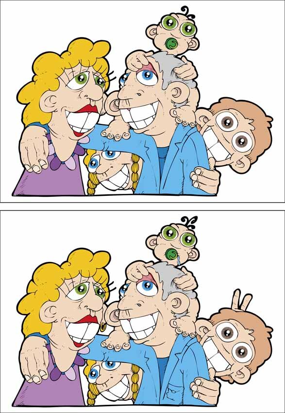 Между прочим, уже давно доказана связь между улыбкой и хорошим настроением. Когда мы улыбаемся, тело посылает сигнал мозгу и начинает вырабатываться гормон счастья эндорфин. Поэтому семейка на картинке поступила совершенно правильно, сделав своим девизом фразу «Никогда не унывать и улыбаться во весь рот!». Предлагаем взять с них пример и улыбнуться, разгадывая нашу новую головоломку. Задание Найдите 10 отличий между, на первый взгляд, одинаковыми картинками Для просмотра отличий пролистните картинку, размещенную ниже Когда Вы ставите лайк и комментируете, мы понимаем, что это задание Вам нравится. Это помогает нам придумывать только интересные головоломки. Плодотворного дня и хорошего настроения! Посмотрите другие наши головоломки на поиск отличий Все иллюстрации к статье созданы автором, источник изображений — pixabay.com