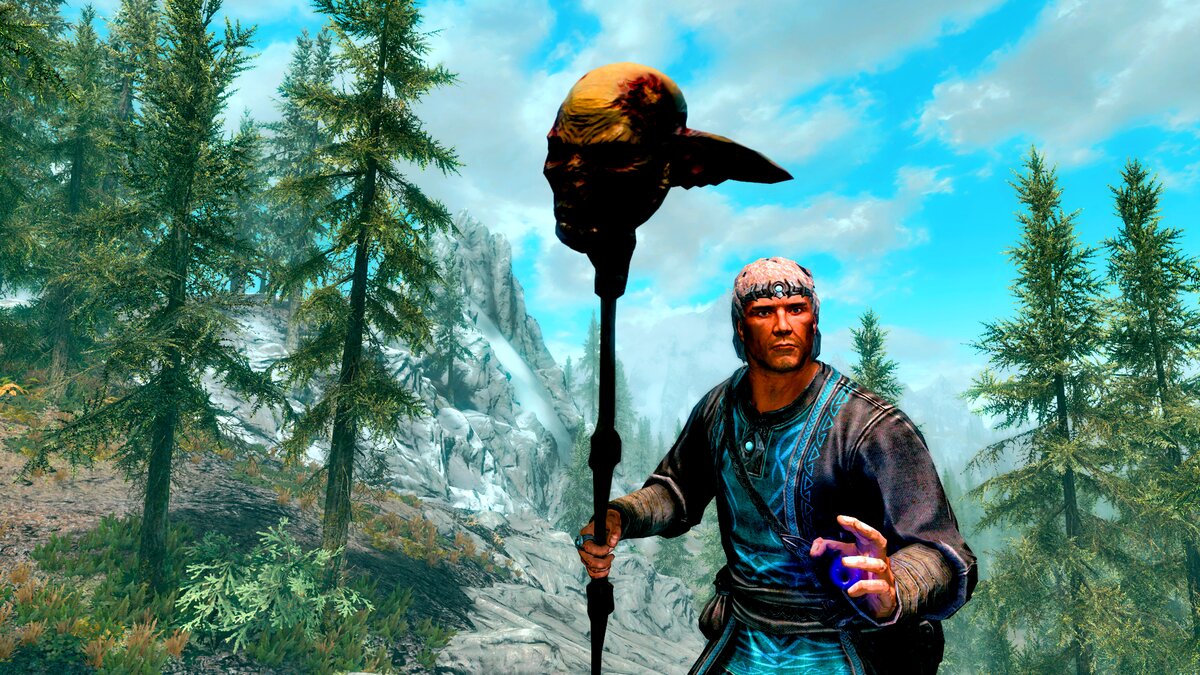 Посох – яркий образец гоблинского рукоделия, то есть – сделан из каках и палок костей и башки гоблина вместо навершия.
