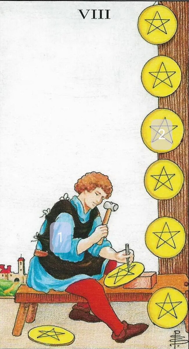 #таро Символика: 1. Чеканщик - трудолюбивый человек. 2. Пентакли, стоящие в ряд - предъявление своих достижений. Полный образ: Восьмёрка Пентаклей символизирует длительный и тяжёлый труд, который, скорее всего, только начался и будет продолжаться ещё долго, а результат принесёт славу и честь создателю. Что показывает Восьмёрка Пентаклей: гадатель находится в самом начале пути и понимает, что ему придётся начать с малого. Но гадатель верит, что его труды не будут напрасны. Что советует Восьмёрка Пентаклей: гадатель может смело ступить на этот путь, но он должен помнить, что это трудно, а переоценить свои возможности чревато последствиями. Гадателю следует много работать и тренироваться, чтобы выполнить свою работу на должном уровне. Что обещает Восьмёрка Пентаклей: гадатель вступил на путь, где его малое дело может стать чем-то большим и принести выдающиеся результаты, но только если гадатель будет усердно трудиться и не будет переоценивать свои возможности.