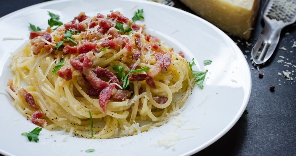 Добрый день, сегодня научу вас готовить спагетти карбонара с красным луком. Спагетти "Карбонара" с добавлением бекона и нежным соусом из пармезана и яичных желтков — потрясающе вкусное блюдо, мужчины съедают его в миг. Блюдо очень сытное, а придумали его итальянские шахтеры. Для приготовления потребуются ингредиенты: 1) Спагетти — 250 Грамм (из твердых сортов пшеницы) 2) Масло сливочное — 20 Грамм 3) Чеснок — 1-2 Зубчиков 4) Лук красный — 1 Штука 5) Бекон — 50 Грамм 6) Сливки — 200 Миллилитров 7) Желток — 4 Штуки 8) Пармезан — 50 Грамм 9) Перец черный молотый — По вкусу 10) Соль — 1 Чайная ложка 1 - Подготовьте все необходимые ингредиенты. Лук и чеснок очистите. 2 - Спагетти отварите в кипящей подсоленной воде до состояния аль денте. Обычно это на 1 минуту меньше, чем указано в инструкции на пачке со спагетти. После приготовления спагетти откиньте их на дуршлаг. 3 - Чеснок нарежьте тонкими ломтиками, обжарьте в разогретом масле до появления аромата. Удалите чеснок со сковор