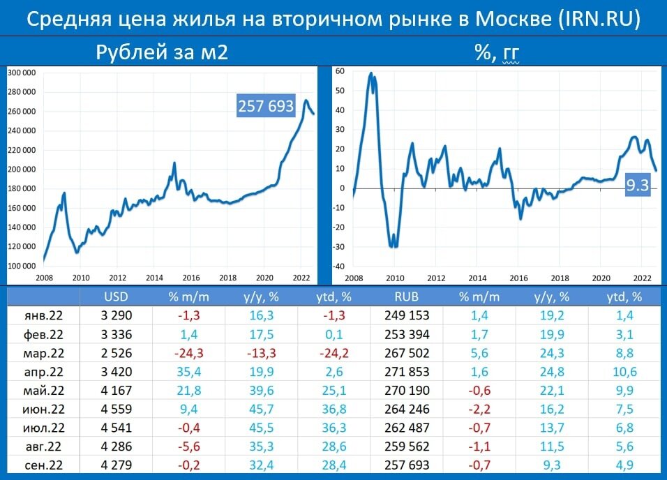 По данным IRN.RU, по итогам сентября цены на жильё в Москве (вторичный рынок) снижались вот уже 5 месяц подряд: -0.7% мм и 9.3% гг опустившись до 257.7 тыс. за квадратный метр (август: -1.1% мм и 11.5% гг). Динамика цен в долларах: -0.2% мм, 32.4% гг - это $4 279 за квадратный метр (в августе: -5.6% мм, 35.3% гг). Эксперты IRN отмечают (https://www.irn.ru/index/), что “… объем предложения на вторичном рынке московского региона снова бьет рекорды: уже в августе он находился на исторических максимумах, но по итогам сентября прибавил еще 15-20%. Парадоксальным образом это замедляет темпы снижения цен предложения – новые продавцы, выходя на рынок, боятся продешевить. При этом реальные сделки заключаются с большими дисконтами…“ В нынешней ситуации, с учетом отъезда части платежеспособного населения, в частности и из Москвы, и ввиду сильно растущего предложения рассчитывать на остановку падения цен, наверное, бессмысленно…