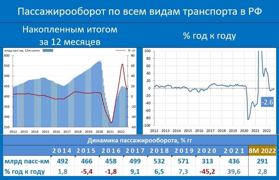 Статистика за август: • -2.6% vs 0.9% гг в июле; 2.8% гг по итогам 8 мес Ухудшение динамики пассажироперевозок в августе не только отражении слабости спроса, но и результат существующих ограничений. Закрытые южные аэропорты, конские цены на авиабилеты и недоступность многих туристических направлений для россиян заставили в этом августе изрядное количество наших соотечественников проводить отпуск дома или на даче. После объявления мобилизации 21 сентября ситуация с зарубежным туризмом стала ещё более проблематичной – кто-то был мобилизован, а кто-то может быть и хотел бы слетать в отпуск, но не может этого сделать ввиду недоступности авиабилетов, которые были раскуплены отъезжающими из страны