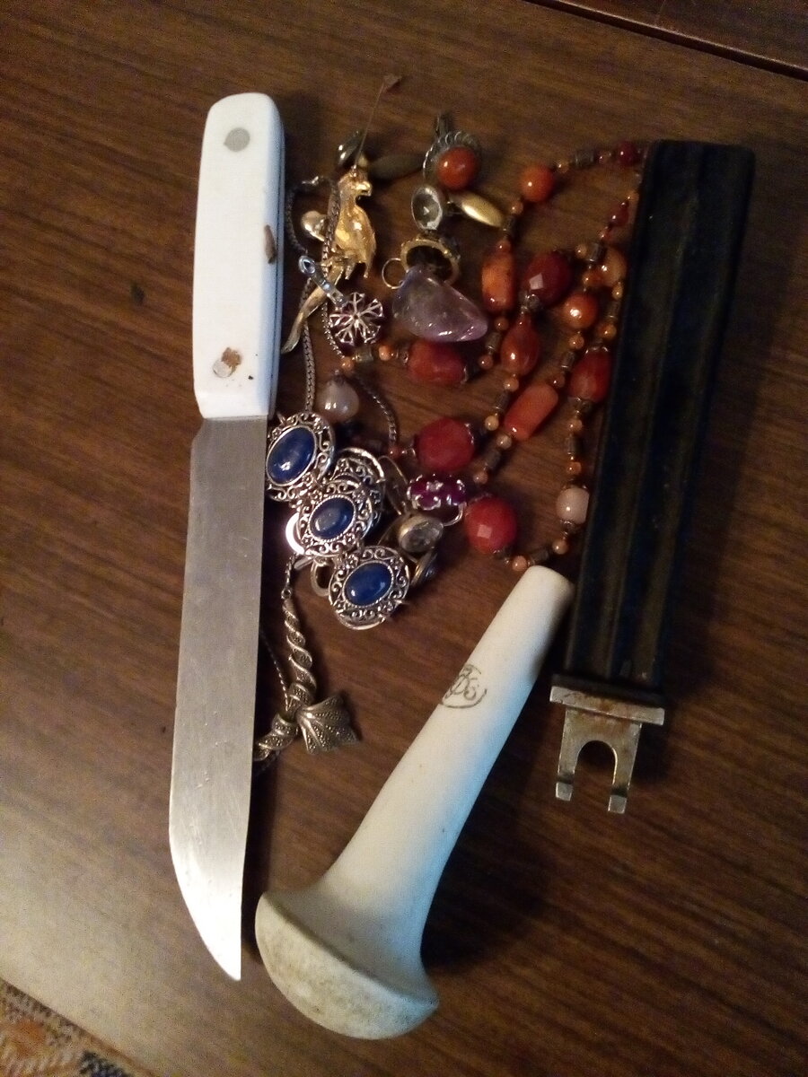 Вот что взял на тихой охоте... Затратил примерно 50 долларов в рублях, естественно. :0)) Кто угадает, за что больше всего уплачено - тот и молодец. Самая дорогая покупка- 1000 р., Самая дешевая - 100. 1000 р. Импорт. Имеет клеймо пробирное РФ. А там где импортное клеймо "925" - еще что-то мелкое проштамповано. Думается - это знак о том, что камни натуральные. Камни достаточно крупные... В итоге - купил. А первая покупка - браслет. Не серебро и не похоже на серебро. В подарок дали кусочек аметиста... Склонен считать натурой (из-за включений пирита). А это подарок: А продавец рядом и говорит: Раз камушками интересуетесь, купите у меня бусы... Так-то за 500 продаю, но вам - за 300! :0) Бусы современные. Но смотрите: колечко запаяно. Бусинки не на нитке, а на тросике... Качество! Открою тайну. Важно не то, что продавец отдает не дорого, важно чтоб перед тобой кто-то вещь себе не приглядел. Сегодня на камушки вообще удачно... Недавно купил брошку-ёлку. Вот к ней ёл