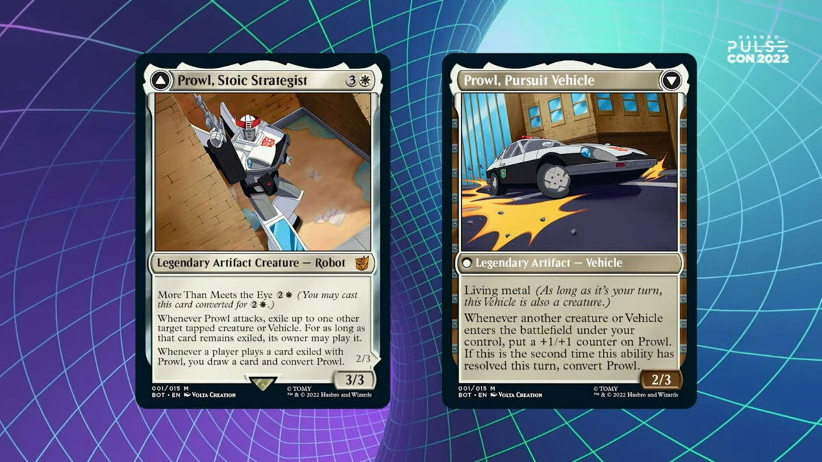 Решение слегка подождать с игровым обзором ради новостей с онлайн-конвенции ПульсКон себя оправдало, правда, несколько не в том ключе, в каком ожидалось. Оказалось, что в 2023 году компания Outright Games (создатели "Transformers: Battlegrounds") выпустит полноценную игру по новому мультсериалу "EarthSpark". Подробностей о ней пока не сообщается. Другим игровым открытием ПульсКона стал набор карточек по трансформерам для настольной игры "Magic: The Gathering". Ранее кибертронцы уже пару раз появлялись в качестве бонусов, теперь же они впервые могут полноценно участвовать в игровом процессе. Всего в рамках кроссовера будет выпущено 15 карточек, но показали из них лишь Оптимуса Прайма, Голдбага, Старскрима, Саундвейва, Лазербика, Слайсера и Флеймвор. На следующий день стал известен весь ассортимент персонажей, добавились Проул, Бластер, Мегатрон, Арси, Блицвинг, Ультра Магнус, Ретчет, Циклонус и Джетфайр. При этом карточки персонажей двусторонние, трансформация обеспечивается новой механ
