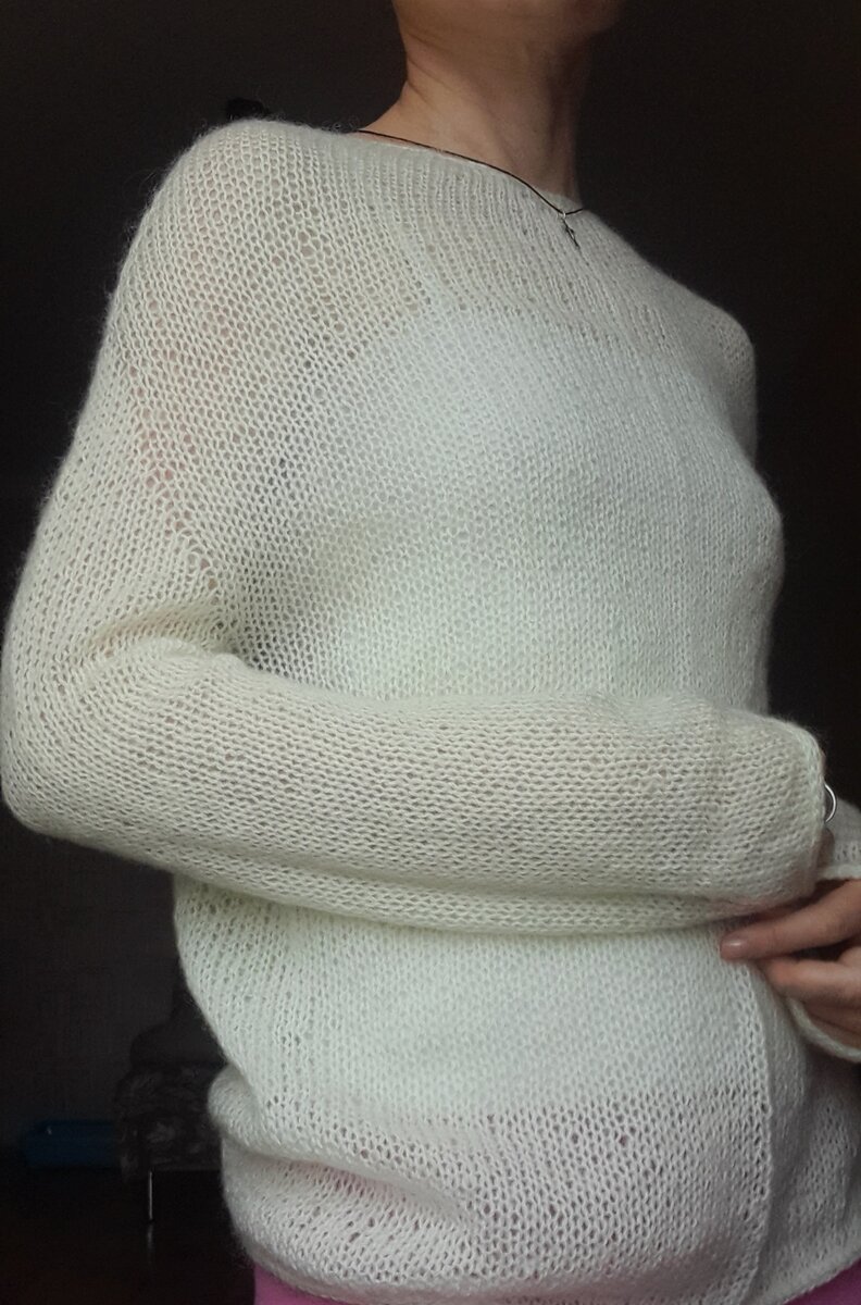Рассказываю, как я вязала джемпер спицами из Ализе Ангора Голд. Он получился очень нежным и воздушным. Я выбрала пряжу "Ализе Ангора Голд" и спицы №5. Джемпер вяжется с небольшим ростком по следующей схеме: На спинку и перед идет по 42 петельки. По 1 петле идет на регланную линию рукавов. Петли переда делим пополам. Затем каждую половину делим на 4 части: 5, 5, 5 и 6 петель. Вяжем так, как показано на схеме. Начало ряда - это регланная петля рукава. Перед и после регланной петли делаем прибавку через ряд. Росток вяжем поворотными рядами, провязывая сначала до первого маркера (мы его ставили после 5 петель от линии реглана), разворачиваемся и вяжем до такого же маркера на второй стороне джемпера. Так провязываем весь росток. Затем будем вязать круговыми рядами, продолжая делать прибавки по реглану через ряд. Для удобства я перенесла начало ряда на спинку. Затем возьмем дополнительные маркеры и отметим по 1 петле по обеим сторонам от регланной петельки. То есть теперь на линию реглана ид