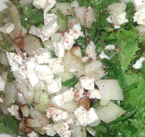 Ингредиенты: Помидоры Огурцы Лук репчатый Лук зеленый Брынза Горчичное масло Укроп Кинза Перец молотый Соль Сметана или майонез Два вида салатных листьев в горшочке Готовим: Помидоры и огурцы могут быть абсолютно разных сортов и размеров. Помидоры: Помидоры разрезаем на половину. Далее половину помидора поделить на части и нарезать. Главное не резать тонко. Можно нарезать немного по другому, взять помидорину и с руки нарезать не ровными кусками. Куски получатся больше по размеру, чем если бы вы нарезали на доске. Помидоры нужно нарезать средними размерами. Огурцы: Берем огурец, разрезаем на три части большой и наполовину маленького размера. Нарезаем огурцы средним размером Помидорина и огурец добавляем в салатницу.