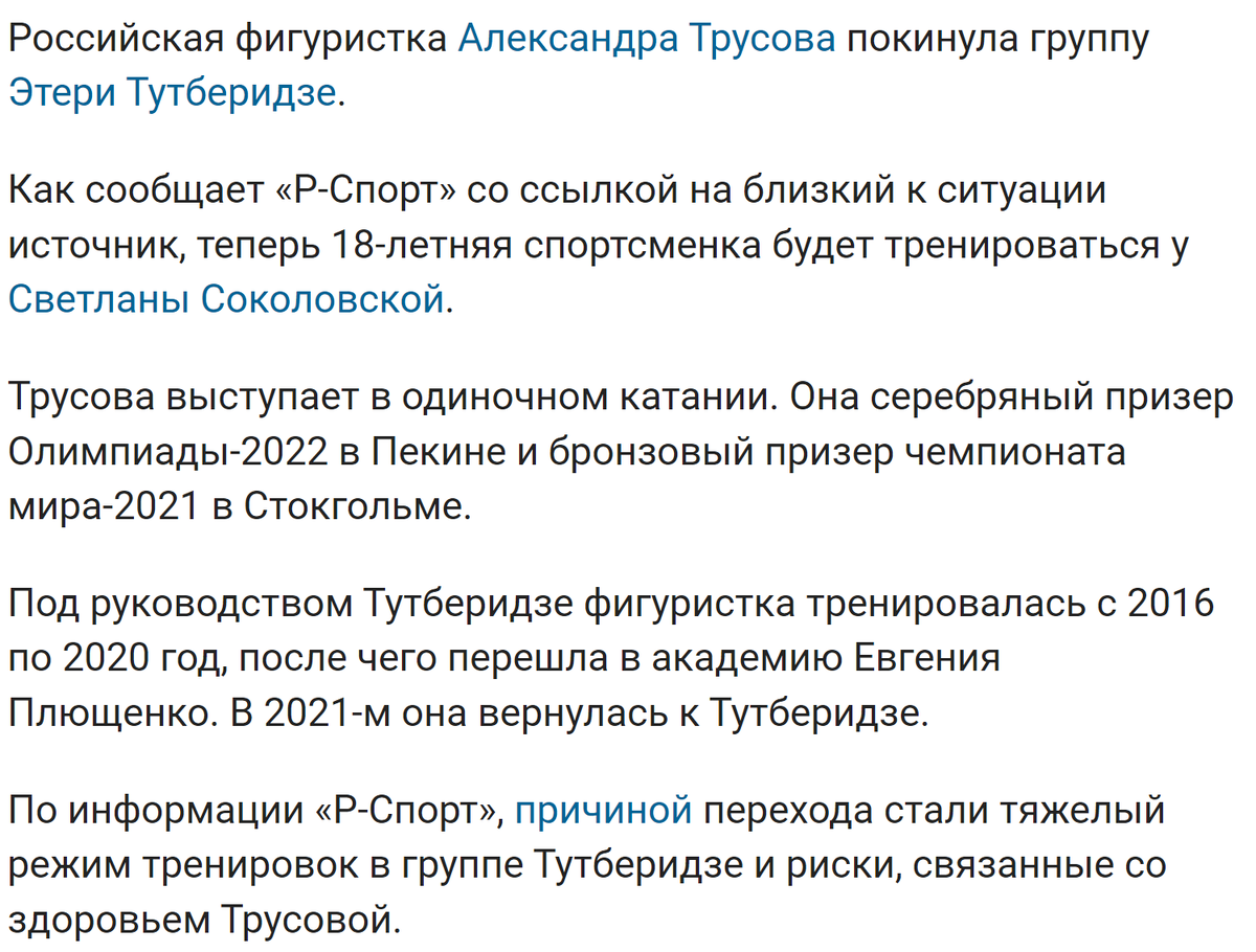 Друзья мои, всем здравствуйте! Помните, неделю назад мы с вами так радовались, что наконец-то начался сезон в фигурном катании? На контрольных прокатах серебряный призер Олимпийских игр Александра Трусова показала новую контрольную программу под блюз - не знаю, как вам, а мне программа понравилась, новый образ ей очень идет. Так вот, похоже, вместе с новым сезоном пришли и сенсационные переходы - иначе я это никак назвать не могу. Журналисты уже на всех парах пишут статьи о том, что Саша перешла в группу Светланы Соколовской! Скажу честно, слухи о переходах Трусовой в ЦСКА ходили уже давно. Мол, Саша хочет быть поближе к Марку Кондратюку, поэтому этот переход логичен. Не хочу вдаваться в подробности и трогать личную жизнь Саши, это ее дело. Какая же причина на самом деле - журналисты написали вот так. Сколько в этом правды - покажет время. Не хочу сейчас говорить о том, насколько правильное это решение или неправильное. Главное ведь то, что приняла это решение Саша сама. Думаю, болельщ