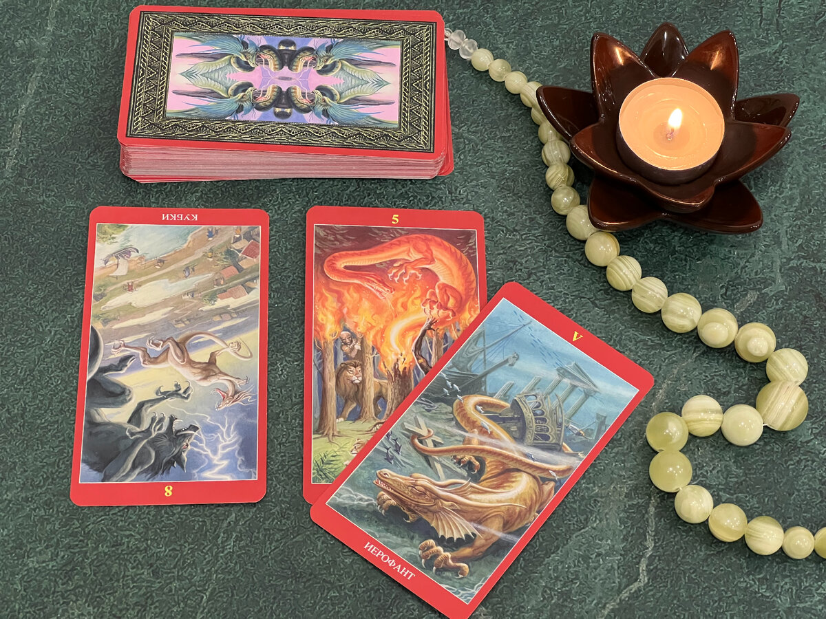 Предсказание на следующую неделю я выполнила на колоде таро Драконов. Это молодая колода, впервые изданная в 2004 году. Автором колоды является Манфреди Коральдо, а художником Северино Баральди. Главными действующими персонажами на каждой карте выступают драконы. Самые разные, маленькие и большие, опасные и не очень. Колода красивая, яркая, но со сложной символикой, требующей внимательного изучения.