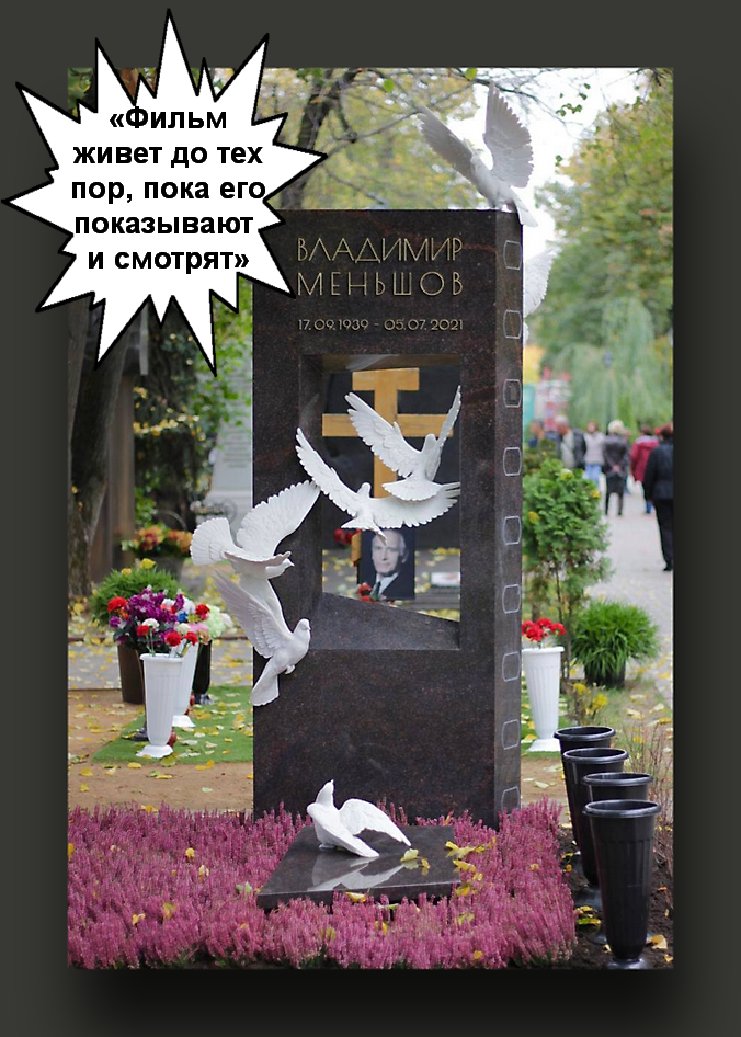 На месте вечного упокоения Владимира Меньшова установили памятник темного мрамора. В центре монумента вырезаны взлетающие к небу белоснежные птицы. За более чем полвека творческой жизни Меньшов завоевал, кажется, все возможные награды, даже статуэтку «Оскар» американской киноакадемии за фильм «Москва слезам не верит» получил в 1981-м. Сейчас сложно поверить, что Владимир Валентинович снял всего пять полнометражных фильмов и три короткометражки, ведь цитатами из его кинокартин можно истории рассказывать. Сценарии и режиссура Меньшова имеет узнаваемый стиль смеси юмора, консерватизма и достаточно продуманных эффектов, каждый из которых обладает особым смыслом. Владимир Валентинович как-то признался - красное словцо, на которое так щедр русский народ, он всю жизнь записывал в специальный блокнот. Потому-то диалоги в его фильмах кажутся такими народными, не выдуманными. Что до актерских ролей, то у Меньшова почти две сотни киноперсонажей. И все они разные - от председателя колхоза, тренера