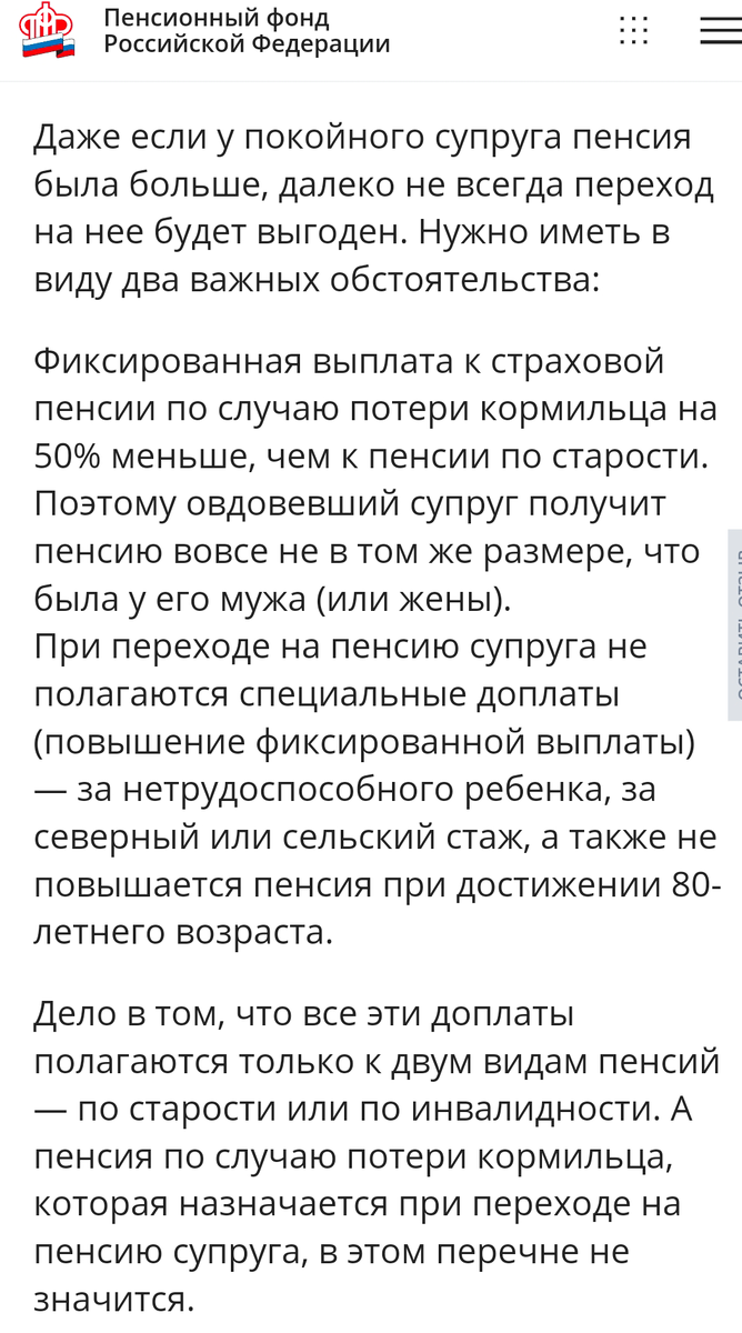 Недавно возник интересный вопрос. Оказывается можно переводить пенсию скончавшихся мужа или жены на супругу или супруга. Приходила к нам клиентка и рассказывала, что ей не выгодно переводить пенсию умершего мужа на себя. У нее пенсия 50 т.р. у него была 100 т.р. При переводе его пенсии на нее получалось 40 т.р. и ей соответственно не выгодно терять 50 и получать 40. Я думал, что пенсия переходит полностью. Ан нет от своей надо отказываться. Коллега поняла, что переводится только 40 % пенсии и только у военных. Обе мысли не верны. Недавно умер 80+ отец мужа родственницы. Осталась вдова. У него была пенсия 20 т.р. у нее 13 т.р. Это потеря бюджета для вдовы. Вот и встал вопрос по переходу на его пенсию. Оказывается это можно и для гражданских тоже. Она отказывается от своих 13 тысяч и переходит на получение его 20 тысяч. Хоть 7 тысяч сохранит. 13 тысяч теряется. Но в переходе на пенсию есть свои нюансы. Почитал в пояснениях пенсионного фонда. Отменяются доплаты и прочие выплаты, которые