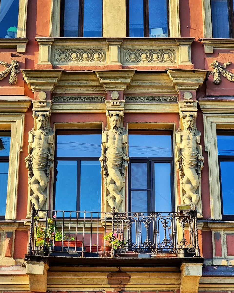 Весной в этой рубрике я показывал вам сову, спрятавшуюся под эркером старинного здания - теперь же хочу обратить ваше внимание на трёх необычных обитателей дома №191 по набережной Фонтанки. Над единственным чугунным балкончиком посередине здания красуются три мужские скульптуры, имеющие по четыре колена и, как следствие, дважды согнутые в них ноги. Таким необычным украшением обладает доходный дом Подобедова 1871 года постройки - архитекторы Карл Лоренцен и Александр Шкляревич. Впрочем, хоть отставной генерал-лейтенант Сергей Подобедов и владел домом почти до революции, фигуры появились ещё до него - при коллежском советнике Евгении Рудакове, который и заказал в 1870-м году перестройку здания и, судя по всему, попросил архитекторов добавить что-то "уникальное". Действительно, больше таких фигур в Питере я не припомню. Прообразом для этих многоколенных сударей, вероятно, стал древнегреческий бог Пан (у римлян - Фавн), покровитель пастушества, скотоводства, плодородия и дикой природы. По