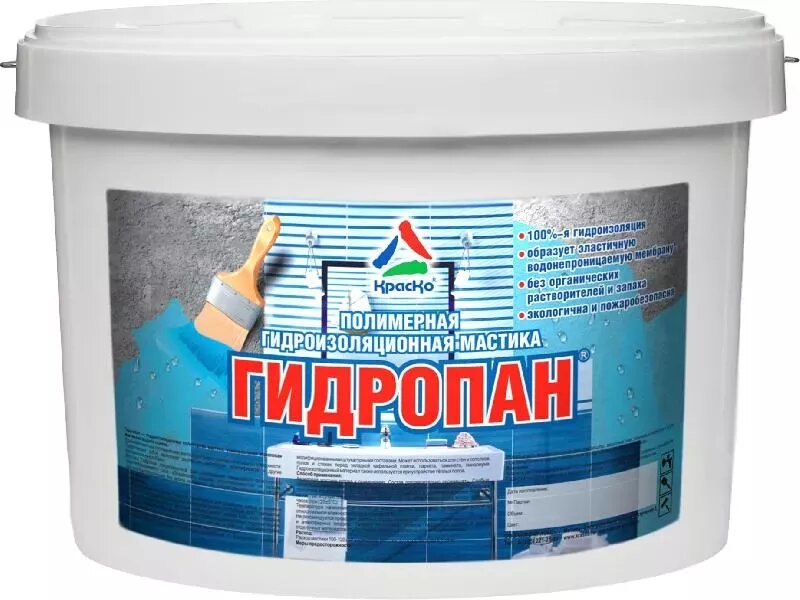 - Гидроизоляционная полимерная мастика «Гидропан» на водной основе обеспечивает 100% гидроизоляцию и образует на поверхности эластичную водонепроницаемую мембрану. Широко востребована благодаря нетоксичному составу, может применятся для внутренней отделки помещений, в том числе потолков, пола перед укладкой отделочных материалов, а также при монтаже теплого пола. Обладает высокими свойствами прочности на разрыв и пожаробезопасностью, высоким сцеплением с различными поверхностями. Материал не имеет запаха и не требует применения специальных средств защиты при использовании.