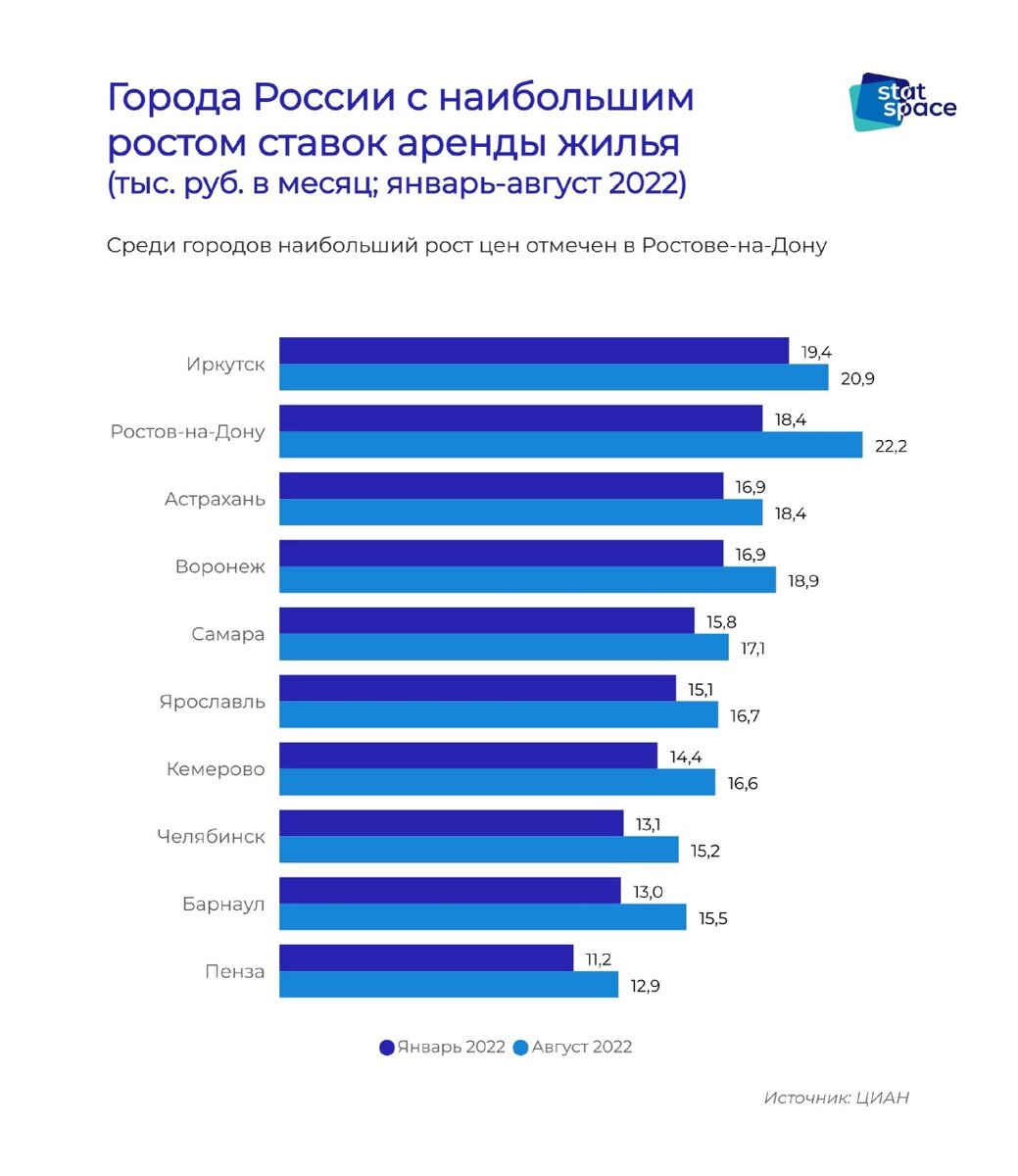 Города России с наибольшим ростом цен на аренду жилья в 2022 году.