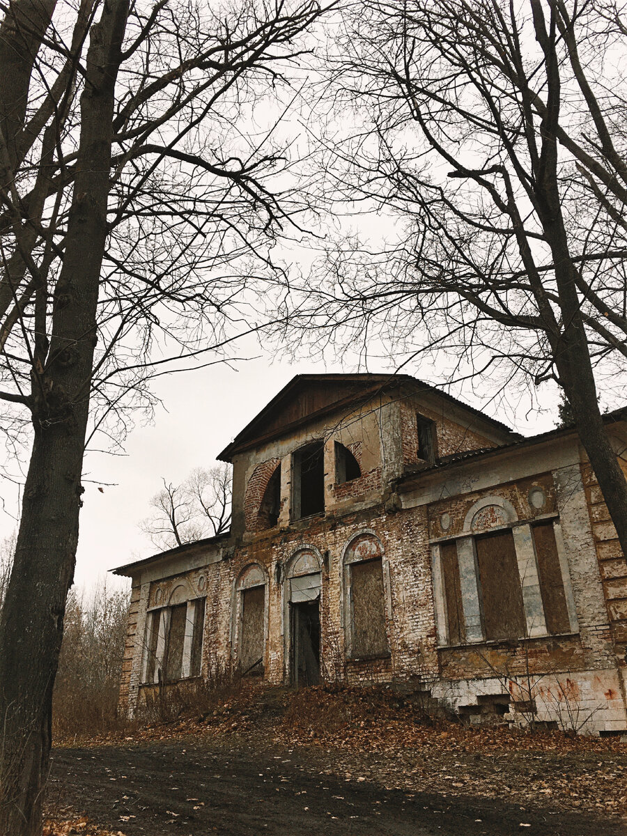 Сейчас мало кто узнает в этой усадьбе ту, в которой когда-то снимался фильм «Формула любви». Время, да и не только, довольно сильно потрепало её. Ещё прошлой осенью, я решил отправиться в эту усадьбу, сделать фотографии и посмотреть в каком состоянии она сейчас. Отличное настроение и беседа в дороге, сделали время в пути почти незаметным. Повернув во дворы и проехав буквально метров 50, передо мной появилось здание невзрачного вида. Изначально, я даже немного разочаровался в увиденном. Начал осматривать местность и меня привлёк стоящий недалеко кусок здания. То была фасадная часть и кусок стены от флигеля. В Советское время в этом флигеле находился детский сад, а впоследствии школа. Сейчас же от всего этого осталась красивая фасадная часть. Вернувшись к усадьбе я решил, что нужно её обойти и обязательно попасть внутрь и тут начинается самое интересное. Как оказалось, самый красивый вид на усадьбу находится с другой стороны. Внутри все полы сняты, возможно кто-то искал клад или же м