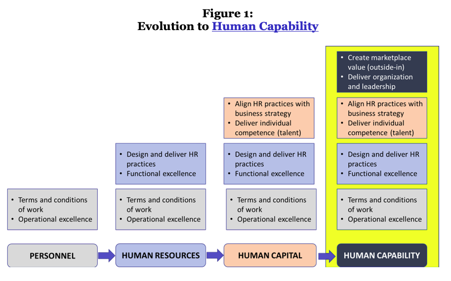 3. Используйте возможности человека. HR обеспечивает ценность благодаря таланту, организации, лидерству и работе с персоналом. Почти неограниченные инициативы в отношении людей и организаций могут быть отражены в структуре человеческих возможностей, которая становится основой для организации и продвижения профессии HR. Эта структура развивает профессию HR от персонала к человеческим ресурсам, человеческому капиталу и человеческим возможностям (рис. 1).