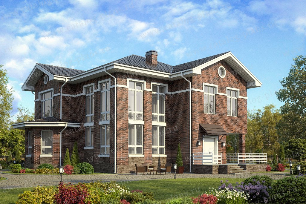 Стены выполнены из газобетонных блоков с наружной отделкой из лицевого кирпича. Цвет кирпича подобран специально и удачно контрастирует с белыми рамами и декоративными фасадными деталями. Проектом предусмотрен плитный монолитный фундамент и монолитные железобетонные перекрытия. Кровля покрыта металлической черепицей. Общая площадь дома 220 квадратных метров при габаритных размерах 15 х 13 метров. Перед входом организована терраса площадью 20 квадратных метров. На первом этаже удобно размещается гостевая зона с большой гостиной, кухней-столовой и гостевой комнатой. За счет двусветного пространства в гостиной царит особая атмосфера, так же здесь предусмотрено расположение камина. Кухня-столовая объединена с гостиной. У входа в дом располагается бойлерная, а тамбур на столько просторный, что позволит разместить в нем шкафы для хранения одежды. На втором этаже располагаются три спальни, одна из которых имеет гардероб. На каждом этаже предусмотрены санузлы. Подробнее о проекте: