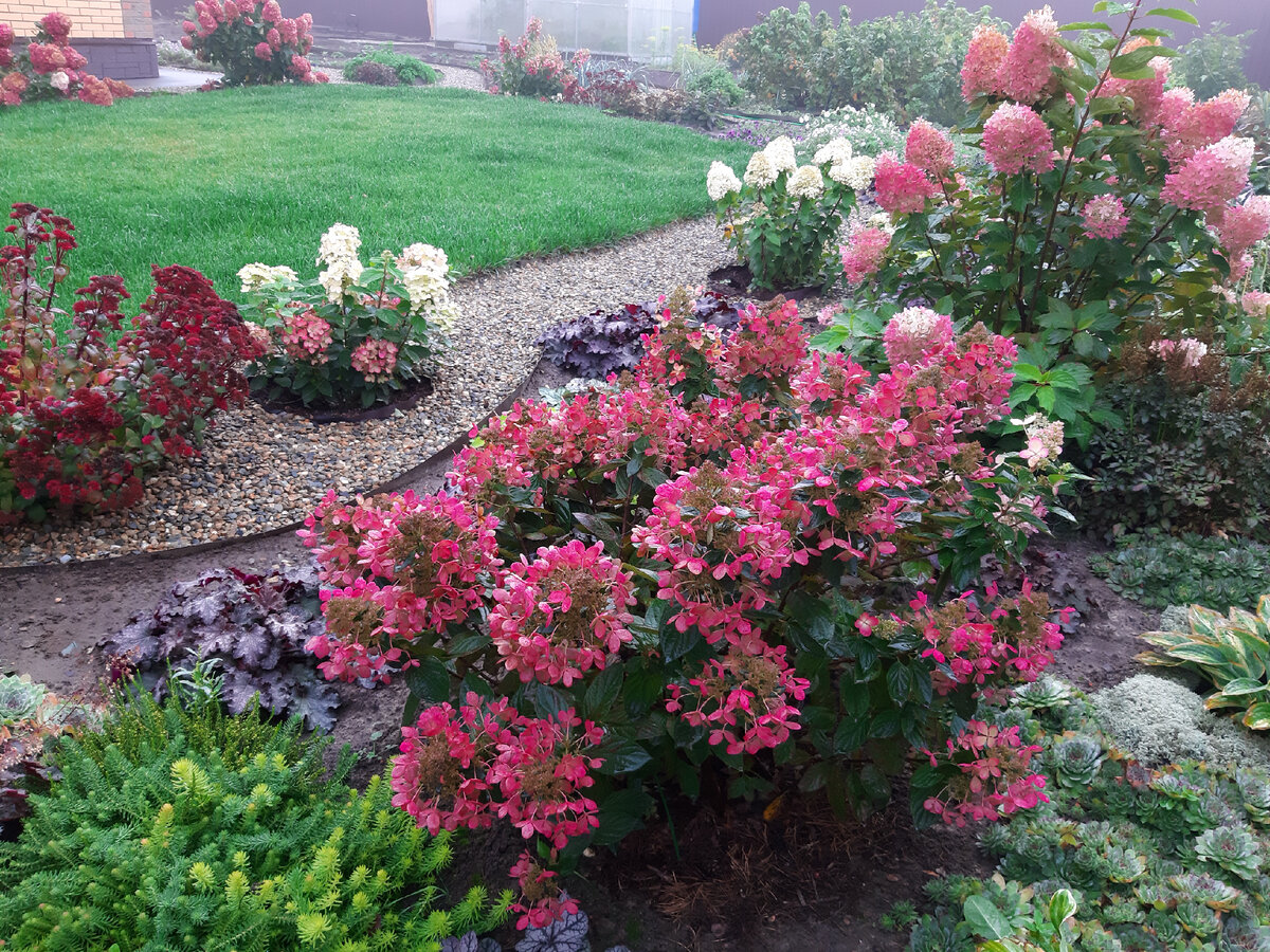 За все лето - один дождь... а сейчас - просто залило. Месяц дожди и дожди. Сильные и каждый день. В саду не все растения рады такой атмосфере. Нравится вода гортензиям - они цветут и торопятся успеть всю красоту выдать - все ярче цвета! Но не все выдерживают воду - у меня из 26 кустов разных сортов - 2 Ваниллы Фрайз улеглись. Остальные - крепкие. А Ванилла не держится: Опоры надо было ставить. Упустила я этот момент. От воды хорошо спиреям: Но у меня песчаные почвы - вот и не замокают. На этот раз песок выручил. Но на газоне повсеместно на третей неделе ливней взошло море грибов! Впервые вижу столько поганок! Газон как болото - трава растет с бешеной скоростью. Вот не пойму - на радостях после адской жары что ли.... Не нравится вода большим петуниям - их цветение сразу страдает: А пышно цвели так - вот они же две недели назад: Вода не мешает жить фуксии - вот она вся в бутонах! И белые агератумы, и малиновая пеларгония, и сиреневый котовник - живы! Даже суккуленты - любители сухой поч