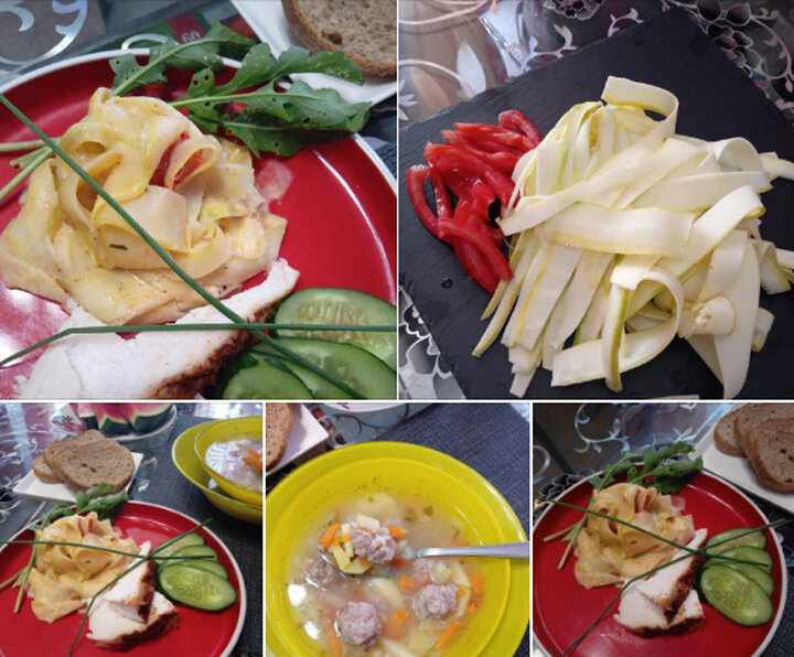 Суп с фрикадельками и спагетти из кабачков на гарнир к куриной грудке