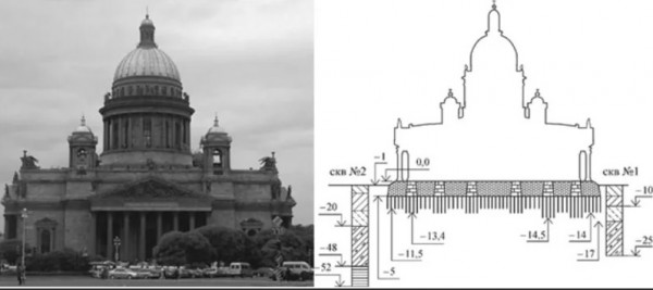 Как утверждает официальная версия истории, О.Монферран, все же, использовал фундамент предыдущего (якобы ринальдиевского собора), ну а под всю остальную площадь якобы заново строящегося здания для его лучшей устойчивости на болотистых почвах Санкт-Петербурга, вначале было забито более 10 тысяч свай. Вот например, что мы можем об этом прочесть в книге Г.П.Бутикова и Г.А.Хвостова "Исаакиевский собор", изданной в 1974 году: "Поставив перед собой сложную задачу соединить старый и новый фундаменты, Монферран прежде всего решил выяснить природу грунта и характер сохранившейся кладки. Все крупные петербургские сооружения строились на сваях, и естественно, что архитектор особое внимание обратил на то, как их забивают".