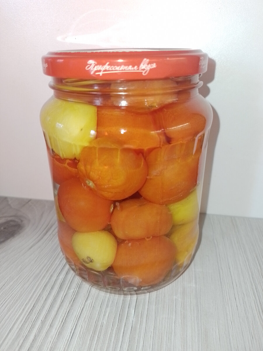 Томатная паста - консистенция по вашему желанию Укладываем помидоры по стерилизованным банкам и заливаем кипятком на 15 минут. Накрываем крышками.