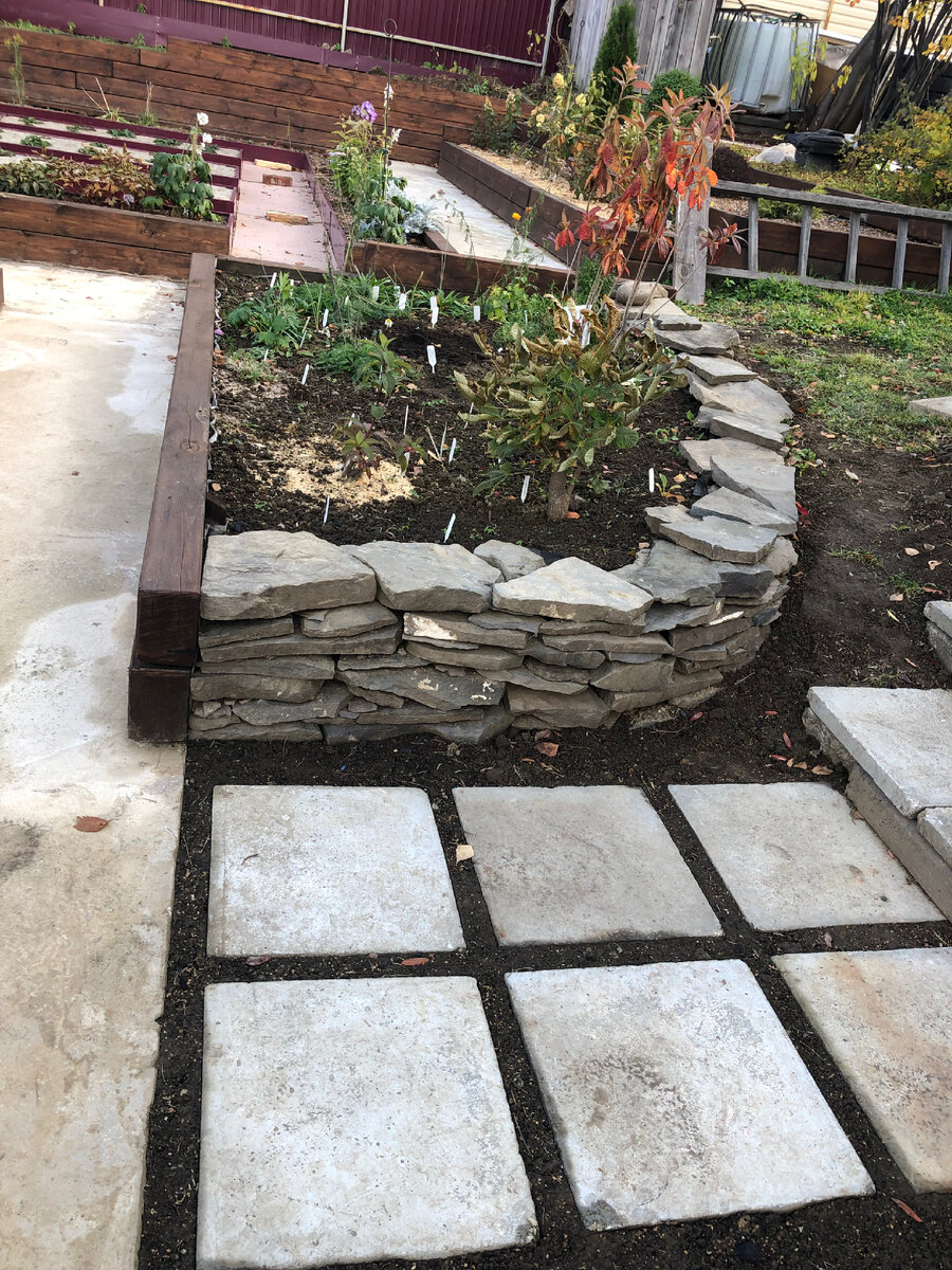 Мне кажется, что именно осенью для таких работ самое время. И скоро объясню почему. Пока же коротко про технологию. В общем всё очень просто. Камни и так достаточно плоские. Берёте глину - литра 3-4 не больше - больше будет трудно мешать ее в небольшой емкости. И потихоньку по стакану начинаете заливать ее водой. Сказать сразу нужное количество практически невозможно, поскольку многое зависит от влажности исходного материала и типа глины. Причём, чем чище будет глина (чем меньше будет в ней песка) - тем лучше. Первый ряд можно просто выложить на твёрдую или протрамбованную землю. Потом на заднюю плоскую его часть наносите раствор глины слоем буквально 1-2 см и выкладываете второй ряд. Камни можно немного подвигать туда-сюда, чтобы скрепляющий раствор лучше распределился. И так все ряды. Только не забудьте отступить от края клумбы или специально убрать землю. Туда будет заложено что-нибудь изоляционное, чтобы вода с клумбы не вымывала глину между камнями. Во-первых, прочность уменьшитс