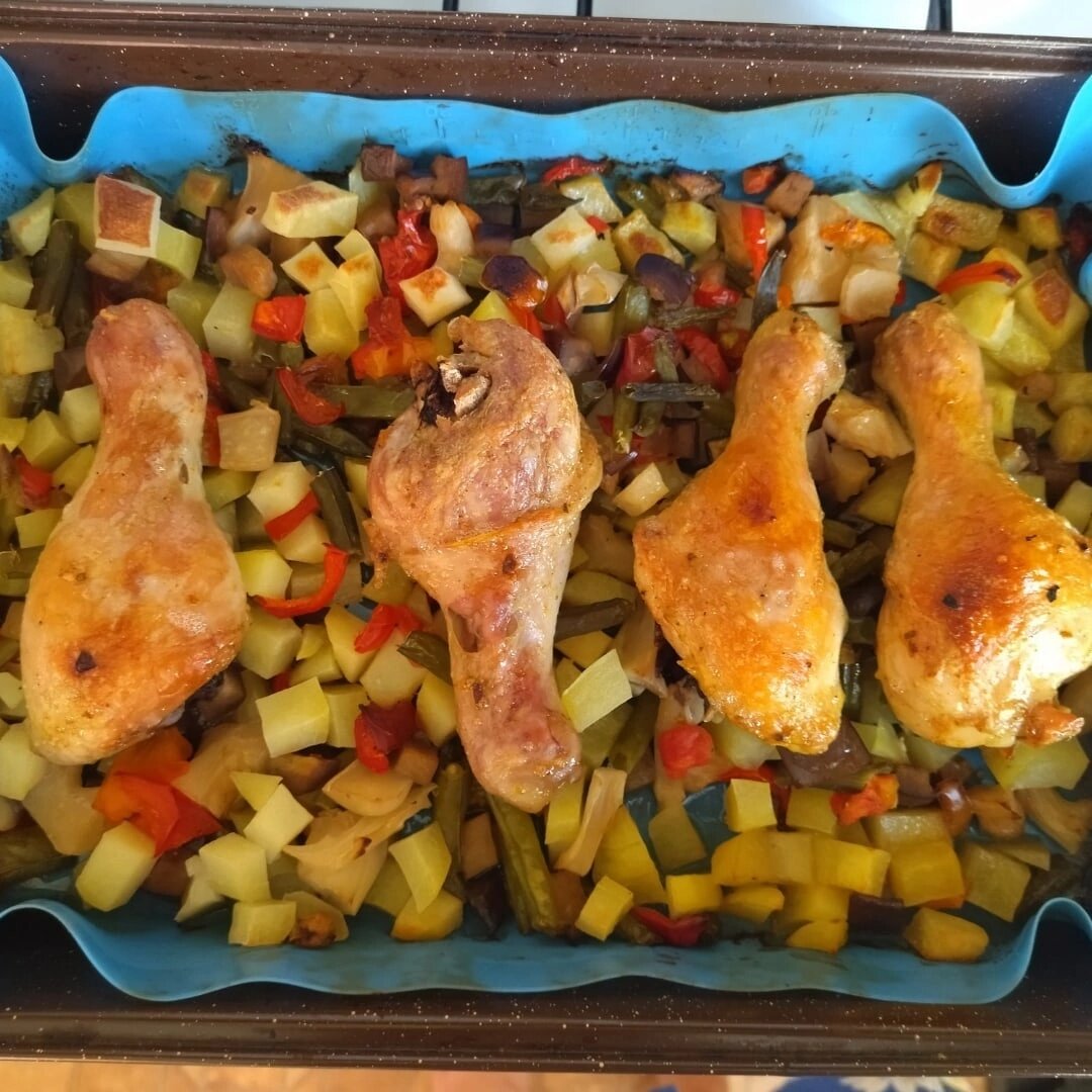 Провожу эксперимент и готовлю 9 блюд из одной курицы. Предыдущий пост вот здесь: Приготовила третье блюдо из предложенных автором - куриные голени запечённые с овощами. Рецепт немного скорректировала и сделала двойную порцию. Овощи взяла такие: баклажан, картофель, перец болгарский, стручковая фасоль, помидор, цветная капуста. Голени обмазывала майонезом, добавила приправу для курицы. И не заворачивала каждую в фольгу, а просто все запекла под фольгой на одном противне. Нам хватило на два полноценных ужина. Вкусно, буду готовить еще.