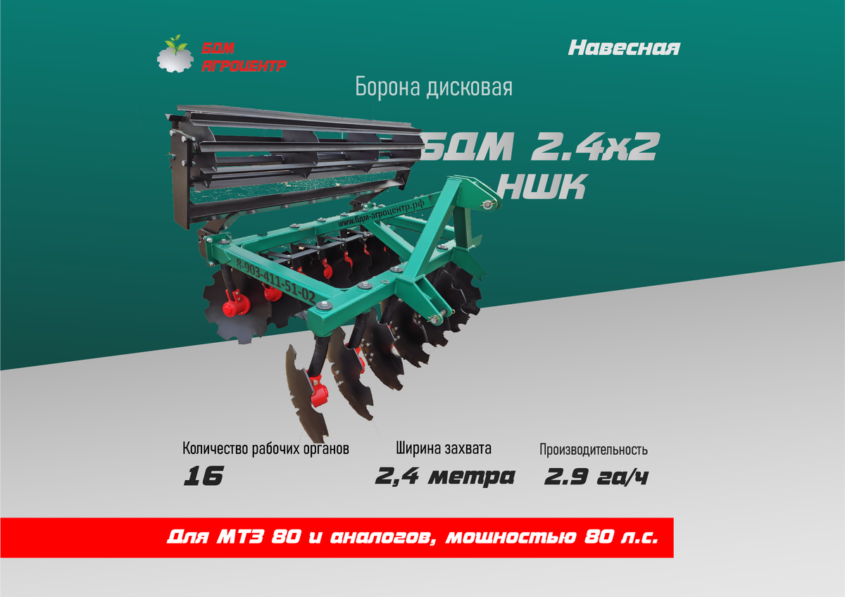 Данное орудие является навесным, предназначено для работы с тракторами, мощностью от 70 л.с. (МТЗ-80 и его аналоги). Ширина захвата составляет 2.4 метра, рабочие органы расположены в 2 ряда по 8 органов в ряду. Расстояние между стойками - 300 мм, сами стойки диаметра 58.5 мм с фрезеровкой под смазку, установлены в независимые втулки. Наличие возможности производить шприцевание смазки в стойки повышает ресурс данного узла и уменьшает затраты на обслуживание. Ступицы обслуживаемые, со стопорным кольцом, идут в связке с дисками БДМ "Ромашка", диаметром 560 мм и толщиной 6 мм. На каждом ряде рабочих органов имеется возможность регулировки угла атаки дисков, в диапазоне от +30 до -30 градусов. Рама выполнена из профильной трубы 100*100*6 мм, а все флянцы изготовлены из металла, толщиной 16 мм. Масса бороны БДМ 2.4х2 НШК - 980 кг. Шлейф-каток - О