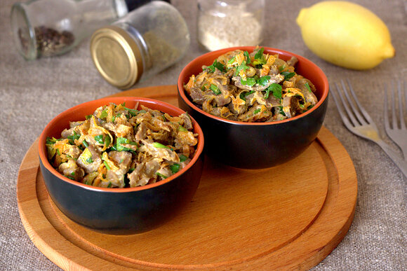 Куриные желудочки хорошо сочетаются с жареной морковью и заправкой на основе сметаны, соевого соуса и лимонного сока. Попробуйте этот незамысловатый салат, и вы удивитесь, что простое блюдо может быть настолько вкусным.