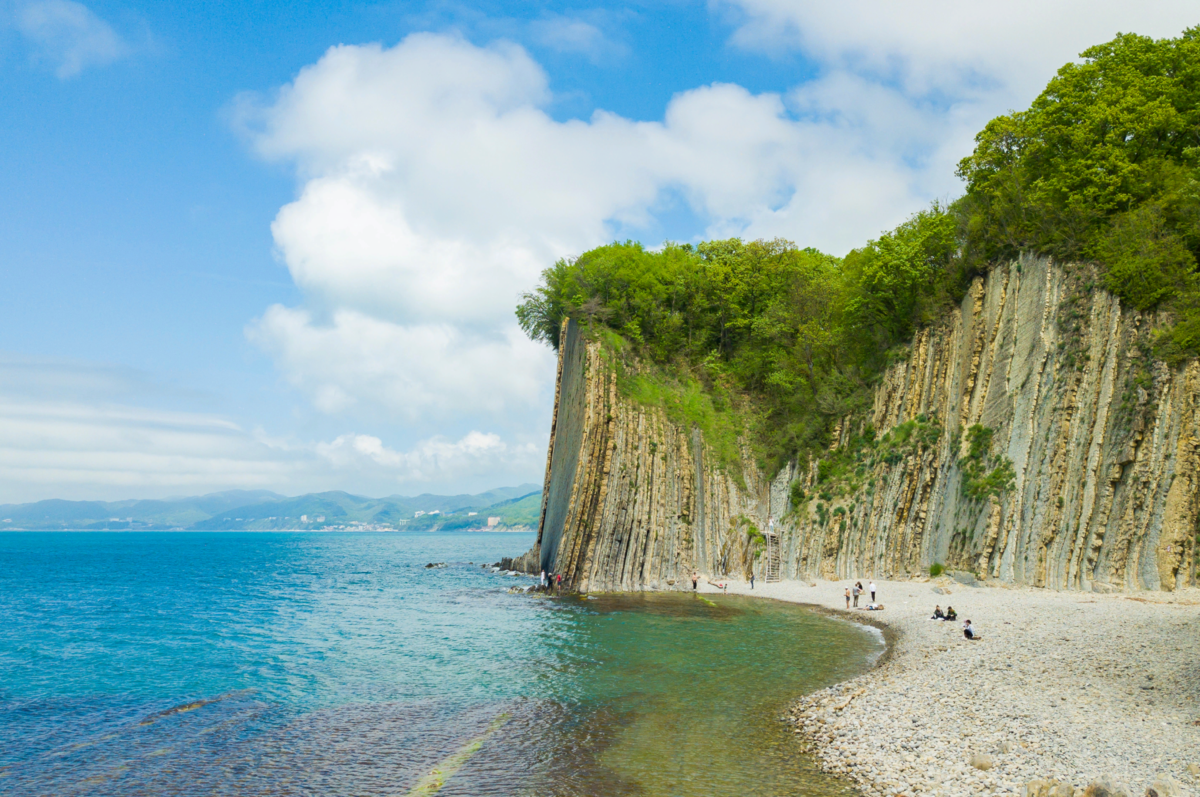 Побережье окружают высокие скалы — на их фоне можно устроить фотосессию.