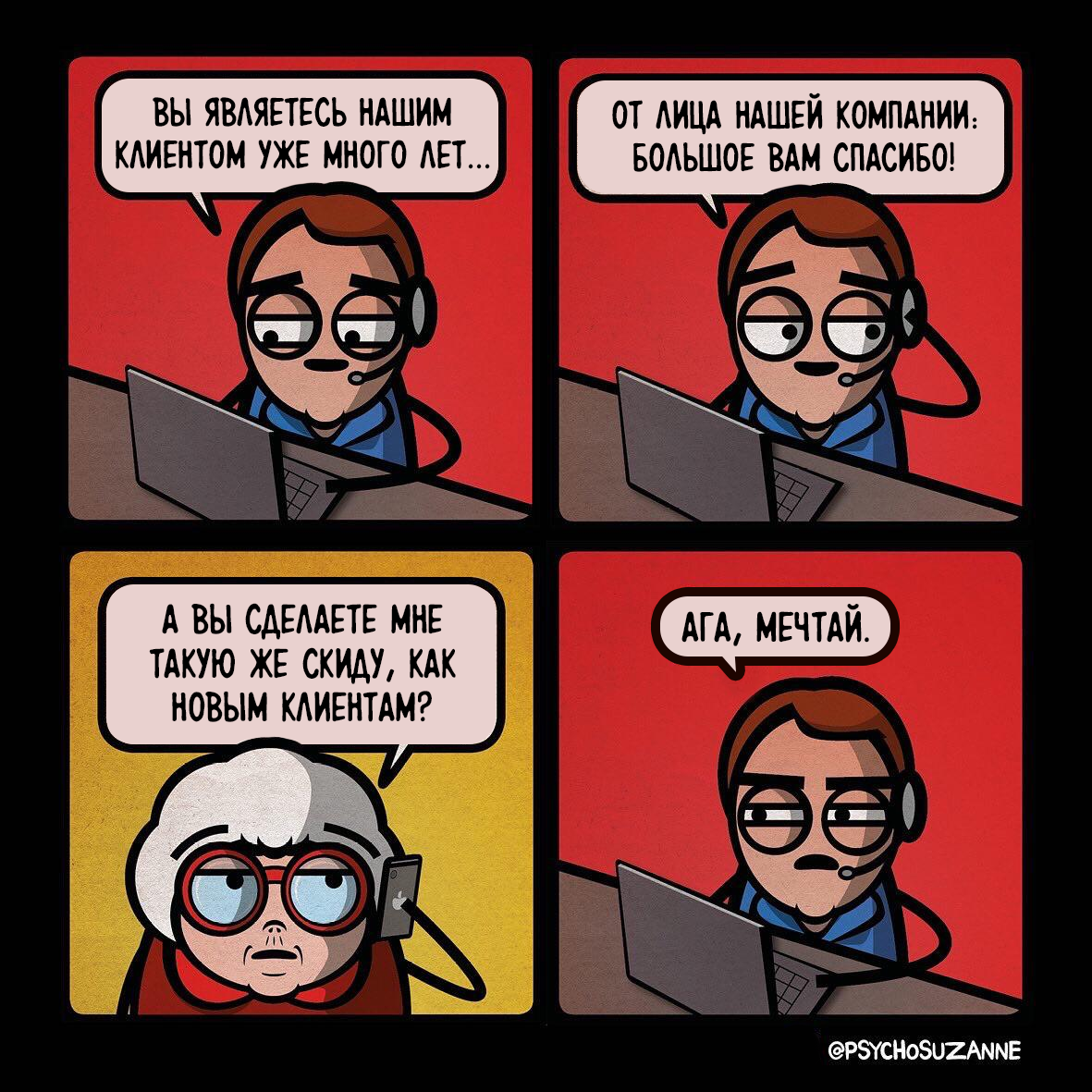 На творчество может вдохновить практически что угодно. Какие-то события, услышанные фразы, произведения других авторов или конкретные люди. Я, к примеру, точно могу сказать, что начать рисовать комиксы я решил во многом потому, что просто с детства любил эту художественную форму. Ну а на каждый конкретный сюжет меня может вдохновить все, что меня окружает. А вот герой сегодняшней статьи создал целую серию комиксов, главным героем которой стал персонаж, срисованный с его собственной бабушки. Кажется, таких комиксов раньше я еще не видел. Psycho Suzanne (англ. «Психо Сюзанна») - это серия юмористических комиксов, созданная французским художником по имени Поль (Paul). Проект стартовал в конце 2020 года, за выходом новых выпусков можно следить на страничках серии в соцсетях (легко найти по нику psychosuzanne), а также на таких сайтах как WebToon и Reddit. Поль живет в Париже и работает графическим дизайнером. Заняться комиксами он решил, когда весь мир сидел на самоизоляции - художнику зах