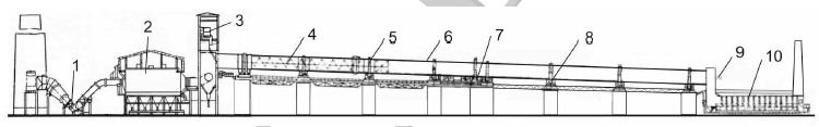 Обжиг цементного клинкера по мокрому способу производится в длинных вращающихся печах с отношением длины к диаметру L/D ≈ 37. Схема вращающейся печи мокрого способа производства: 1 - дымосос; 2 - электрофильтр; 3 - шлампитатель; 4 - теплообменные устройства в виде цепных завес; 5 - бандаж; 6 - корпус печи; 7 - привод печи; 8 - роликоопора; 9 - горелка для подачи топлива; 10 - колосниковый клинкерный холодильник. Наибольшее распространение в последние десятилетия прошлого столетия получили вращающиеся печи диаметр 5 м и длиной 185 м с колосниковым холодильником «Волга-75» производительностью 72-75 т/ч при условном расходе топлива 201 кг/т клинкера. В настоящее время в цементном промышленности РФ эксплуатируются вращающиеся печи мокрого способа следующих типоразмеров: Вращающиеся печи мокрого способа эксплуатируются длительное время от 30 до 60 лет. Они практически не подвергаются модернизации и обновлению. Первый завод по сухому способу в СССР был построен в 1957 г. с вращающейся печью