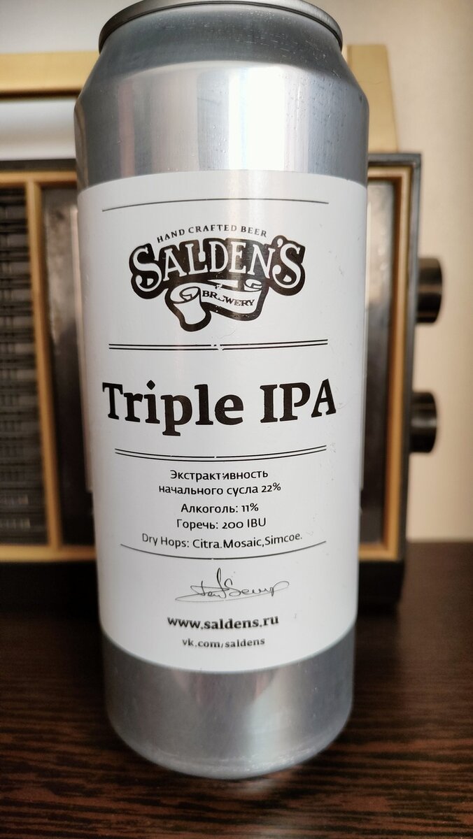 Привет всем! Сегодня ещё один вкусовой эксперимент. Встречаем! Натали Килурзо, соосновательница пивоварни: набирает обороты, более любопытный стиль: тройной IPA (TIPA или IIIPA). Вам действительно мало обычного IPA, сессионных IPA, двойного IPA или Imperial IPA (DIPA или IIPA)? IPA повсюду прямо сейчас, но, как и в других сферах, пивоварам необходимо постоянно внедрять инновации, чтобы оставаться актуальными. Я успел отойти от вчерашних коктейлей по рецепту @damanosobachka, вчера успел купить ром и этот экземпляр. (Не ну а чего, дамы пьют пиво с горечью 40-60 и говорят нормально, ну яж мужик и пикабушник =)) В магазине разливных напитков, на востоке города Санкт-Петербурга, за 225р. купил это пиво. Это не новинка, но как то не решался покупать до вчерашнего вечера. Этикетка "стандарт" от пивоварни Салденс, отверстие для налива у банки не расширено, что редко встречается. Пиво светлое, нефильтрованное, неосветленное, пастеризованное. По составу: вода, солод пивоваренный, хмель, дрожжи.