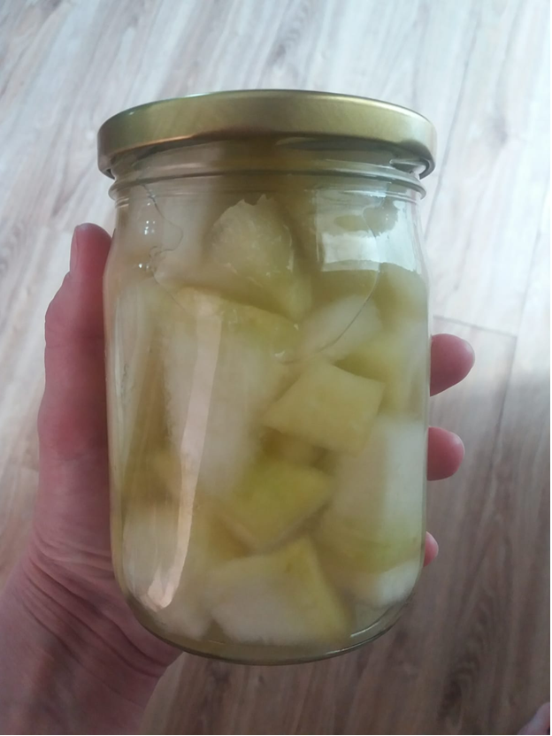 Дыню промыть, убрать семена, очистить от кожицы, нарезать кубиками и сложить в простерелизованные банки. Банки залить кипятком, оставить на промежуток времени от 30 до 50 минут. Воду слить в раковину.
