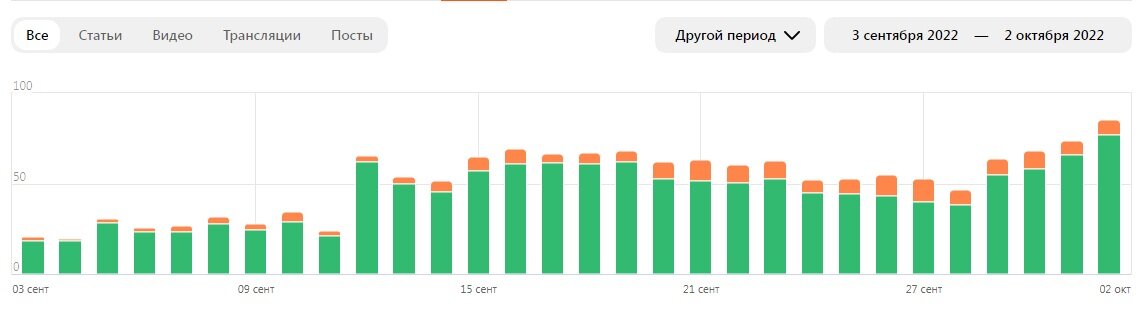 Глючит последние дни площадка, поэтому сразу сообщаю, доход вырос на 100% или в два раза, кому как привычнее. Подпишитесь, когда баги пофиксят, почитаете. Более развернуто чуть ниже. Предложение подписаться в силе) Начисления за реальный сентябрь, поэтому выборка со 2 сентября по 2 октября, не забываем про двухдневное смещение начислений. Для сравнения данные за август Очень хорошо виден водораздел дат, когда Дзен перешёл окончательно под руку ВК. Выплаты выросли почти вдвое. И еще одно совпадение начали начислять денежку и за короткие видео в поиске Яндекса. Вот и гадай теперь, то ли и раньше начислялось, но воровалось, то ли и вправду совпадение. А раз начали дополнительные начисления делать, видно что и оранжевая фапочка, символизирующая рекламные начисления от поисковика немножко потолстела. Ближе к концу месяца виден рост графика начислений. Связываю это с двумя факторами. Во первых я увеличил общее количество материалов, их ежедневное количество приближается к 10. В