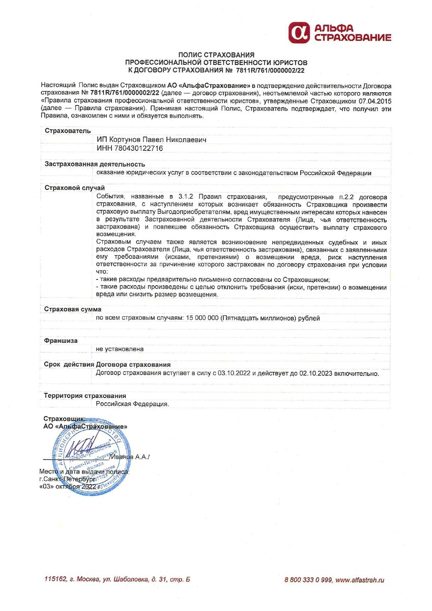 Проявляем уважение к нашим клиентам практическими делами. Спешим сообщить, что застраховали свою профессиональную ответственность на 15 000 000 рублей в страховой компании "АльфаСтрахование", обладающей наивысшим рейтингом ruAAA. В сумму страхового возмещения включаются: • Реальный ущерб, причиненный Выгодоприобретателю – расходы, которые лицо, чье право нарушено, произвело или должно будет произвести для восстановления нарушенного права; • Расходы по уменьшению причиненного страховым событием убытка; • Стоимость погибшего имущества, расходы на восстановление поврежденного имущества; • Судебные расходы. Любая профессиональная деятельность, в том числе и юридическая, связана с риском причинения вреда вследствие непреднамеренных ошибок. Страховщик возмещает ущерб, причиненный в результате непреднамеренной профессиональной ошибки, допущенной сотрудниками Страхователя, а именно: • пропуск процессуальных сроков, предусмотренных гражданским процессуальным, арбитражным процессуальным зако
