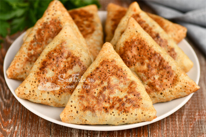 Это блинное тесто называю «Всё по одной». Оно настолько простое в приготовлении, что никакие весы и мерные стаканы не потребуются, и рецепт теста даже записывать не надо, запоминается сразу и навсегда. А еще эти блинчики очень нежные, мягкие, тонкие с отличным вкусом. Их можно подавать просто так или заполнять любимой начинкой. Покажу, как готовлю блинчики с печенью, и еще как делаю из блинчиков красивые треугольники. Порции 18 шт. Время подготовки 30 минут Время приготовления 1 час Ингредиенты Для теста: Для начинки: Инструкции 1. Таким способом готовлю начинку из любого мяса и субпродуктов. Печень нарезаем на средние куски и варим в подсоленной воде 15 минут. Затем промываем, пропускаем через мясорубку и отправляем в обжаренный лук. 2. Добавляем 1 половник бульона, в котором варилась печень, перчим и нагреваем несколько минут. Пробуем на соль и начинка готова. Так она всегда получается сочная и вкусная. 3. Быстро замешиваем блинное тесто. Кефир, молоко и муку замеряю обычной кружкой