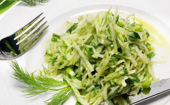 • растител. масло, соль по вкусу. Приготовление 1. Отвариваем яйца, охлаждаем, рубим кубиками. Отправляем в салатник. 2. Нарезаем свежие огурцы соломкой. Потом точно так яблоко, предварительно очищенное от семечек и кожицы. Яблоко сразу же обрызгиваем 1 ч. лож. сока лимона. И огурцы, и яблочко – в салатник. 3. Измельчаем зеленый лук, потом всю кинзу и всю петрушку, далее свежий укроп. Зелень добавляем в салат. Следом пропущенный через чесноч
