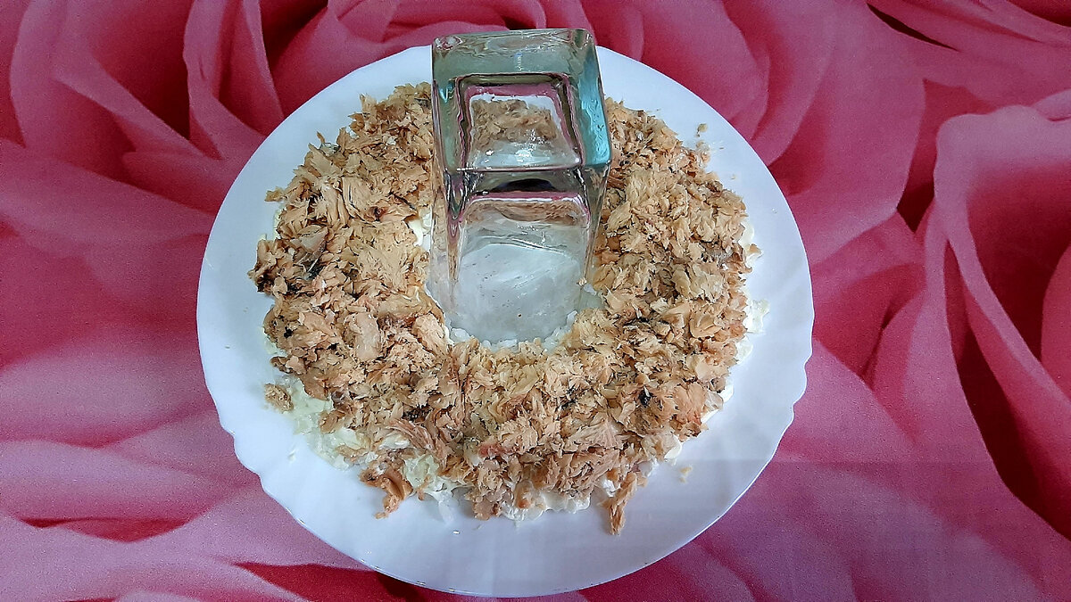 Простой в приготовлении салат. Обычно готовлю его, когда остается рис, приготовленный на гарнир. Ингредиенты: Рис - 100 г (1/3 стакана) Яйцо куриное - 2 шт. Горбуша консервы - 1 банка Морковь - 1 шт. Лук репчатый - 1 шт. Майонез Растительное масло Приготовление: 🐠Рис отварить в подсоленной воде, остудить. 🐠Морковь натереть на крупной терке, лук мелко нарезать. 🐠Приготовить из лука и моркови поджарку. На растительном масле жарим лук, затем к нему добавляем морковь и жарим до готовности. 🐠Салат выкладываем слоями, каждый слой смазываем майонезом, солить не надо. 🐠В центр блюда можно поставить перевернутый стакан, чтобы салат получился в форме кольца. 1 слой - рис. 2 слой - измельченная горбуша. 3 слой - поджарка. 4 слой - яйцо, натертое на мелкой терке. Смазывать майонезом последний слой не надо. 🐠Достаем стакан и оставляем салат пропитаться на 2 часа. Приятного аппетита. Подписывайтесь на канал, будем готовить вместе. Другие мои рецепты: